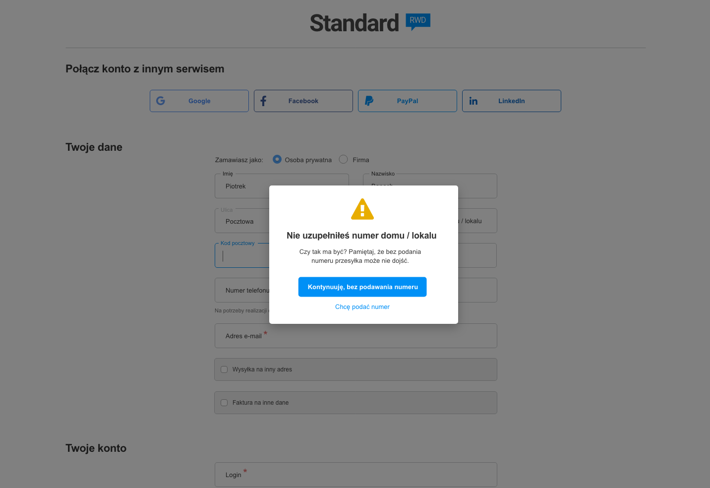 Wsłuchując się w Państwa sugestie, zamiast jednego pola na adres, pojawiły się 2 pola. W jedno klient wpisuje ulicę, w drugie numer domu, dzięki czemu nie zapomni podać numeru domu. Z myślą o zagranicznych adresach umożliwiliśmy teraz pozostawienie pustego pola na numer domu. Jeżeli tak się stanie, użytkownik zostanie zapytany czy pominięcie tego pola jest przeoczeniem czy celowym działaniem. Jeżeli potwierdzi, że jest to celowe, działanie będzie takie jak dotychczas. Uznaliśmy, że to najlepszy sposób działania tych pól, bez potrzeby wymuszania podania adresu, które nie w każdym przypadku musi się sprawdzić.