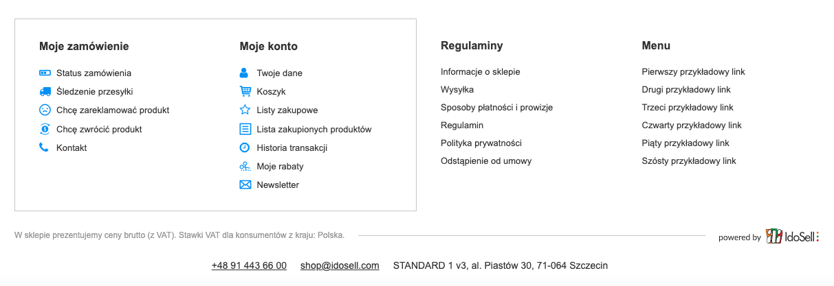 Najnowsza rewizja szablonów STANDARD przynosi również obsługę wyczekiwanej możliwości zmiany cen w twoim sklepie bez konieczności rekodowania maski. Od teraz możesz decydować czy ceny widoczne dla twoich klientów są wartościami netto lub brutto korzystając z nowego modułu od IdoSell. Informację o wyświetlanych cenach znajdziesz w przeprojektowanej stopce. Stopka pokazuje też dla jakiego kraju naliczone są stawki VAT, co współgra z wprowadzonym w czerwcu modułem obsługi VAT OSS.