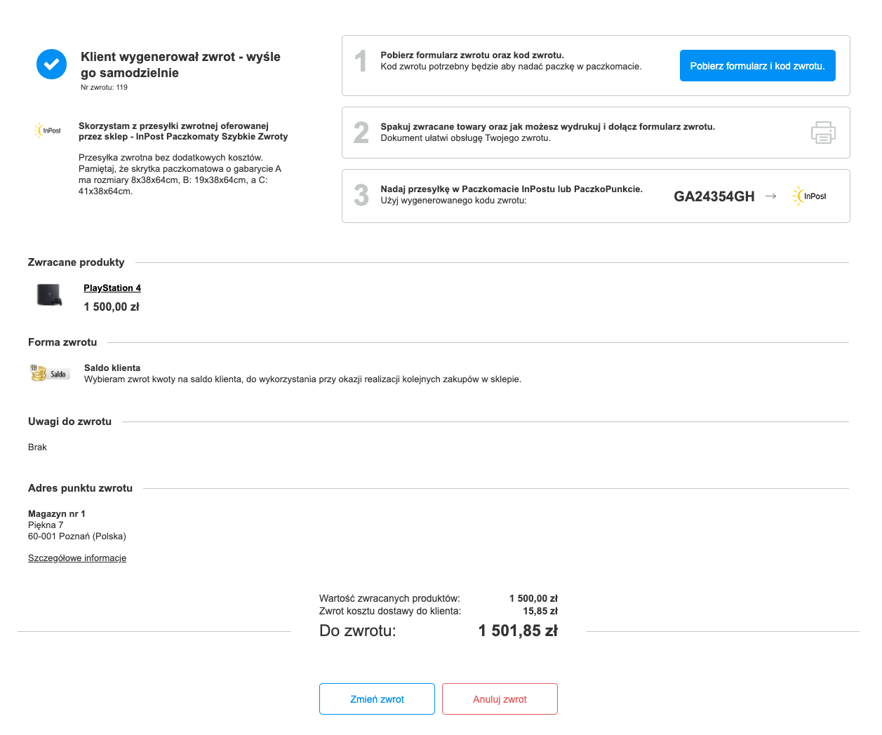 Karta zwrotu uległa znaczącemu odświeżeniu, by jeszcze bardziej ułatwić proces odsyłania nietrafionych zakupów. Jest to możliwe dzięki przejrzystej prezentacji kroków, które należy podjąć aby dokonać zwrotu oraz czytelnemu podsumowaniu wartości zwracanych produktów. Karta ułatwia także nadawanie zwrotu z Paczkomatu "kodem", bez potrzeby drukowania etykiety. Ten element będzie wkrótce dostępny we wszystkich sklepach IdoSell korzystających z najnowszych masek STANDARD.