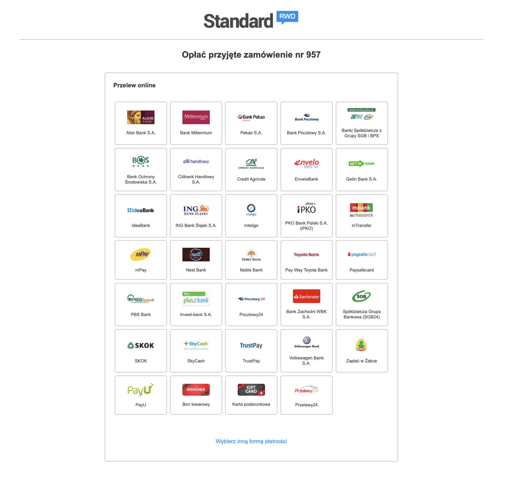 Jeżeli podczas składania zamówienia wybrano ekspresowy przelew online lub kartę płatniczą, wybór banku lub rodzaju karty zostanie wyświetlony tuż po złożeniu zamówienia. Klienci zdecydowanie chętniej wracają do sklepów, które oferują bezproblemowe i szybkie zakupy, dlatego też uproszczenie procesu składania zamówienia może spowodować istotny wzrost sprzedaży, co w ostatecznym rozrachunku przełoży się na większe zyski.