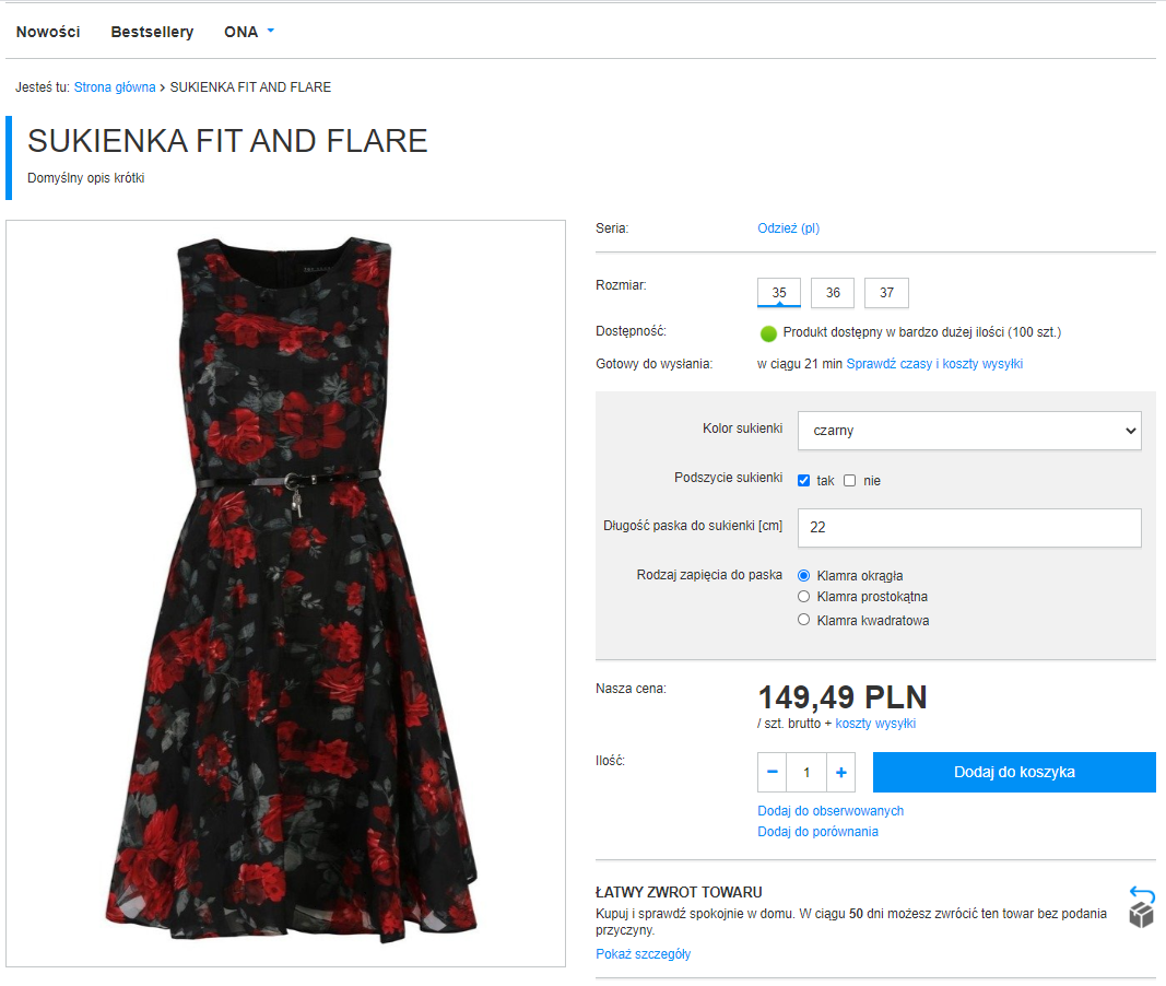 Karta towaru z wyborem parametrów, wpływających na ostateczną cenę wyliczaną za pomocą formuły JS