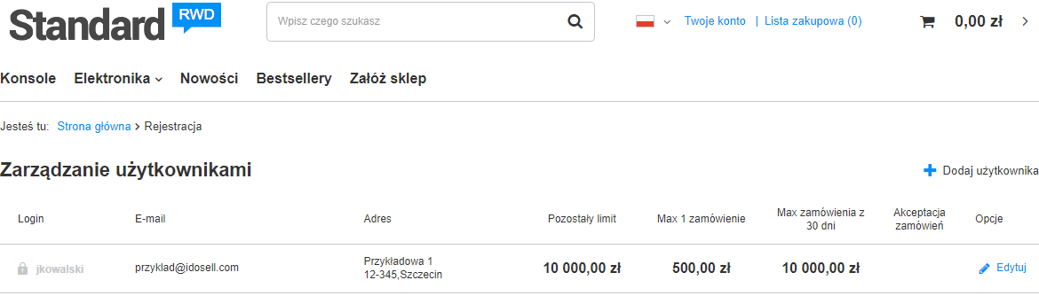 Umożliwia kontrolowanie listy klientów i ręczne zatwierdzanie ich jako hurtowych. Klient określa sposób rozliczania VAT, wprowadza dane firmy i szczegóły dostawy. W razie potrzeby może też załączyć dokumenty potwierdzające prowadzenie działalności.