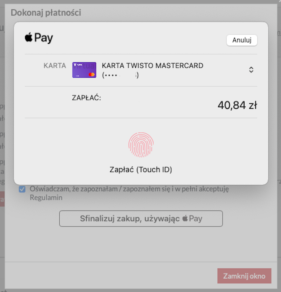 Wprowadzając do usługi IdoPay płatności Apple, chcemy maksymalnie ułatwić proces opłacenia zakupu. Od złożenia zamówienia do momentu płatności są tylko dwa kroki. Klik w przycisk "Sfinalizuj zakup, używając Apple Pay" i potwierdzenie biometryczne palcem (Touch ID) lub twarzą (Face ID).
