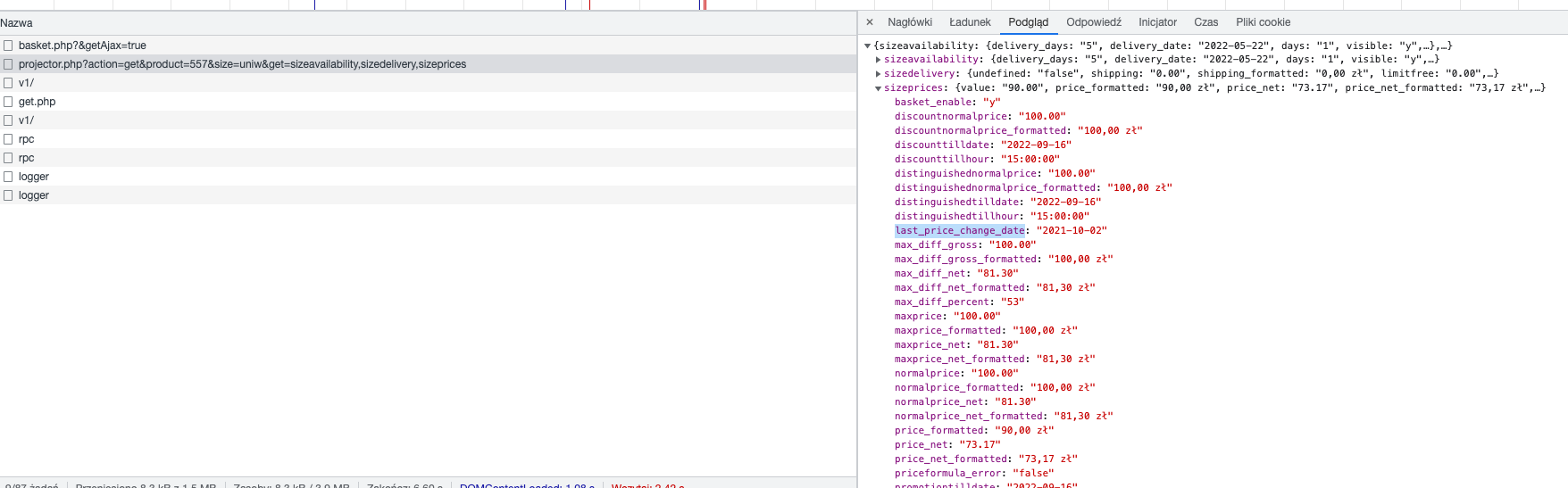 W bramce Ajax projector.php dodaliśmy atrybut sizeprices.last_price_change_date