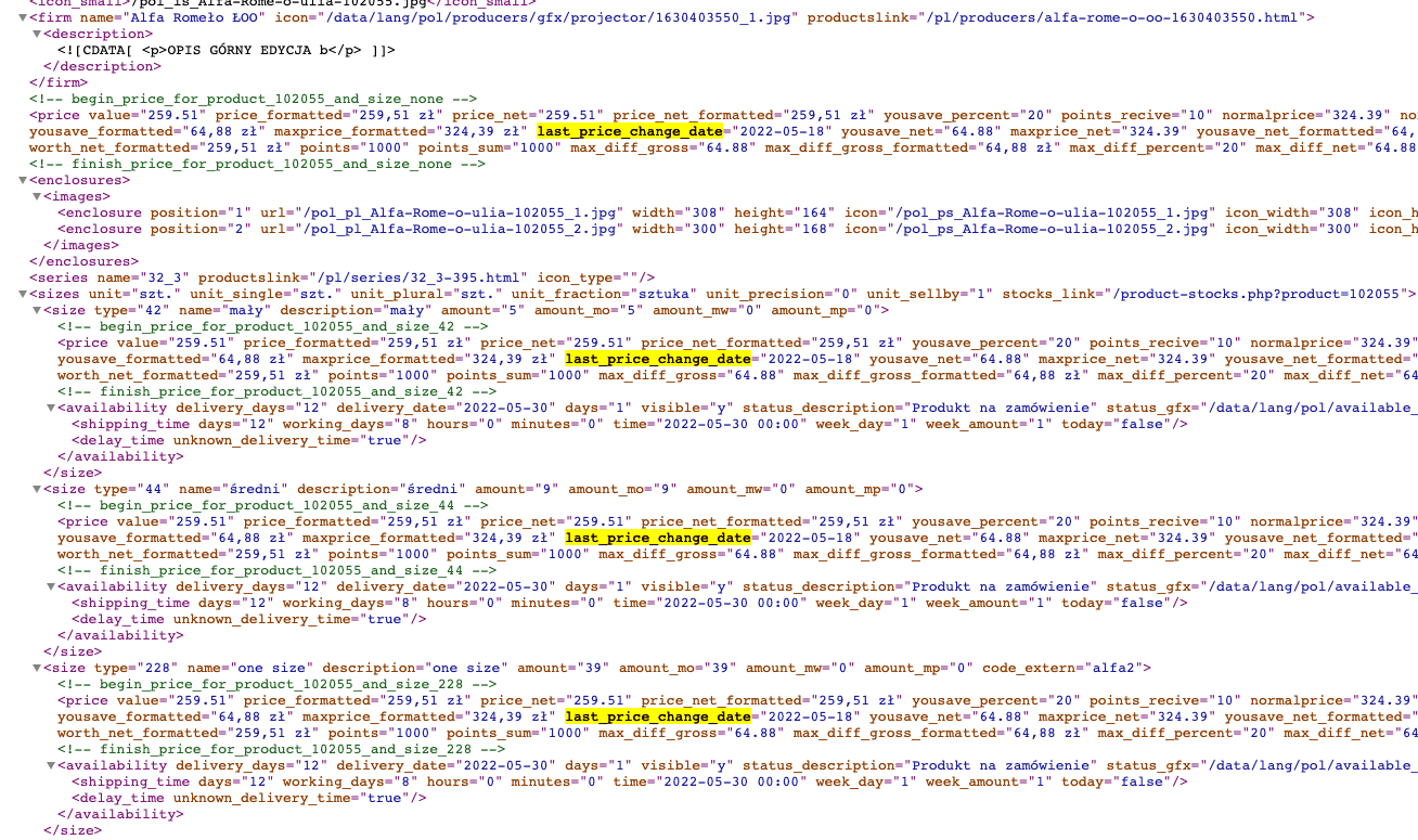 W XML do węzła product/price dodaliśmy atrybut @last_price_change_date