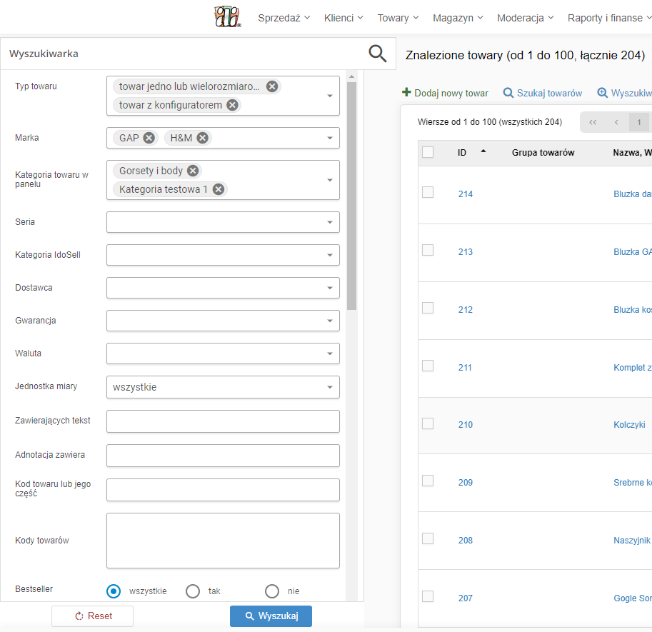 Widget zapewni ci możliwość filtrowania wyników po wielu kryteriach, m.in. kategoriach, markach, seriach, kategoriach IdoSell.