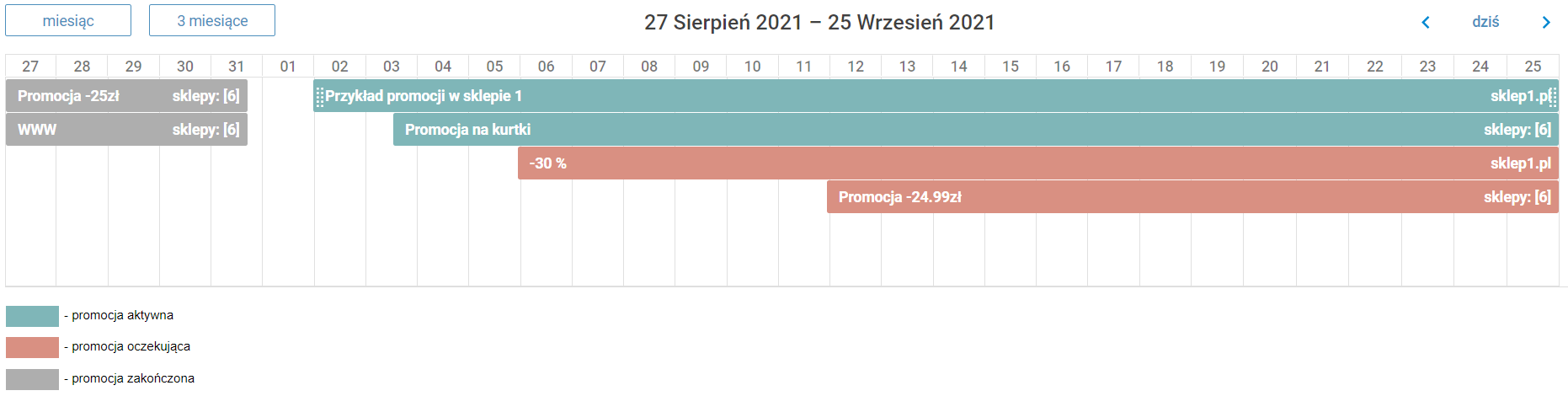 Nowy widok, czyli kalendarz promocji, jest teraz bardziej czytelny. Dokładnie wiadomo, jakie promocje, w jakich sklepach i w jakim przedziale czasowym zaplanowałeś w swoich sklepach. Jeżeli preferujesz dotychczasowy widok, zadbaliśmy o możliwość powrotu do standardowego prezentowania promocji, czyli do listy.