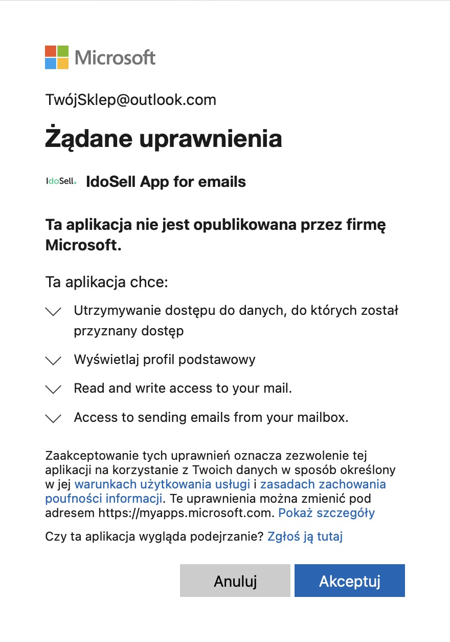 Po kliknięciu przycisku "Zaloguj się w usłudze Microsoft" otworzy się nowa karta w przeglądarce, w której zostaniesz poproszony o zalogowanie się kontem Microsoft. Będziesz musiał wyrazić zgody potrzebne do tego, żeby możliwe było wysyłanie wiadomości e-mail z poziomu panelu IdoSell.