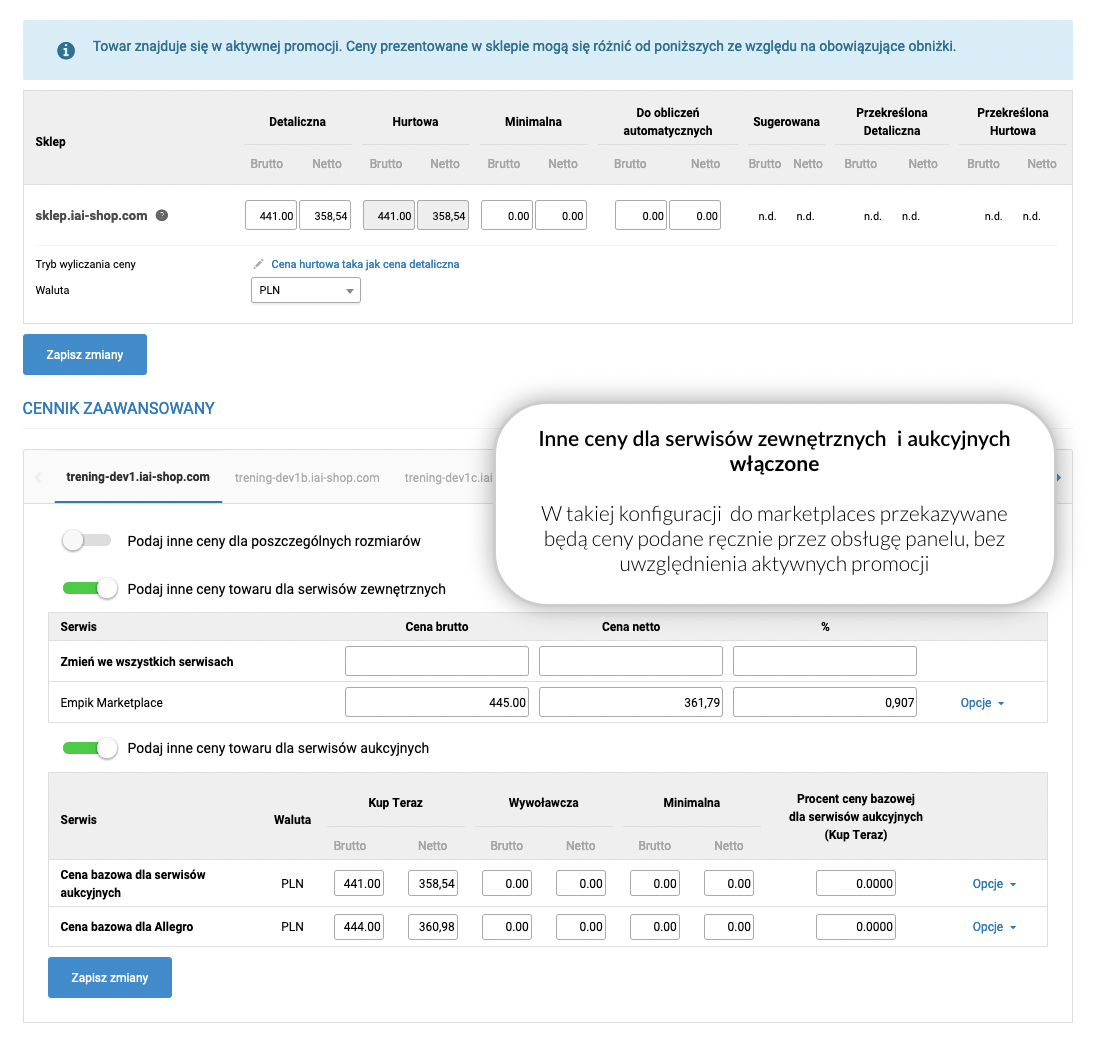 Na karcie towaru znajdziesz teraz informację, czy dany towar znajduje się w promocji. Jeśli tak, zobaczysz stosowną informację podczas edycji cen. Informacja ta jest widoczna w zakładce z cenami towaru. Dodatkowo przy każdym ze sklepów, w którym obowiązuje promocja, zobaczysz ikonę znaku zapytania