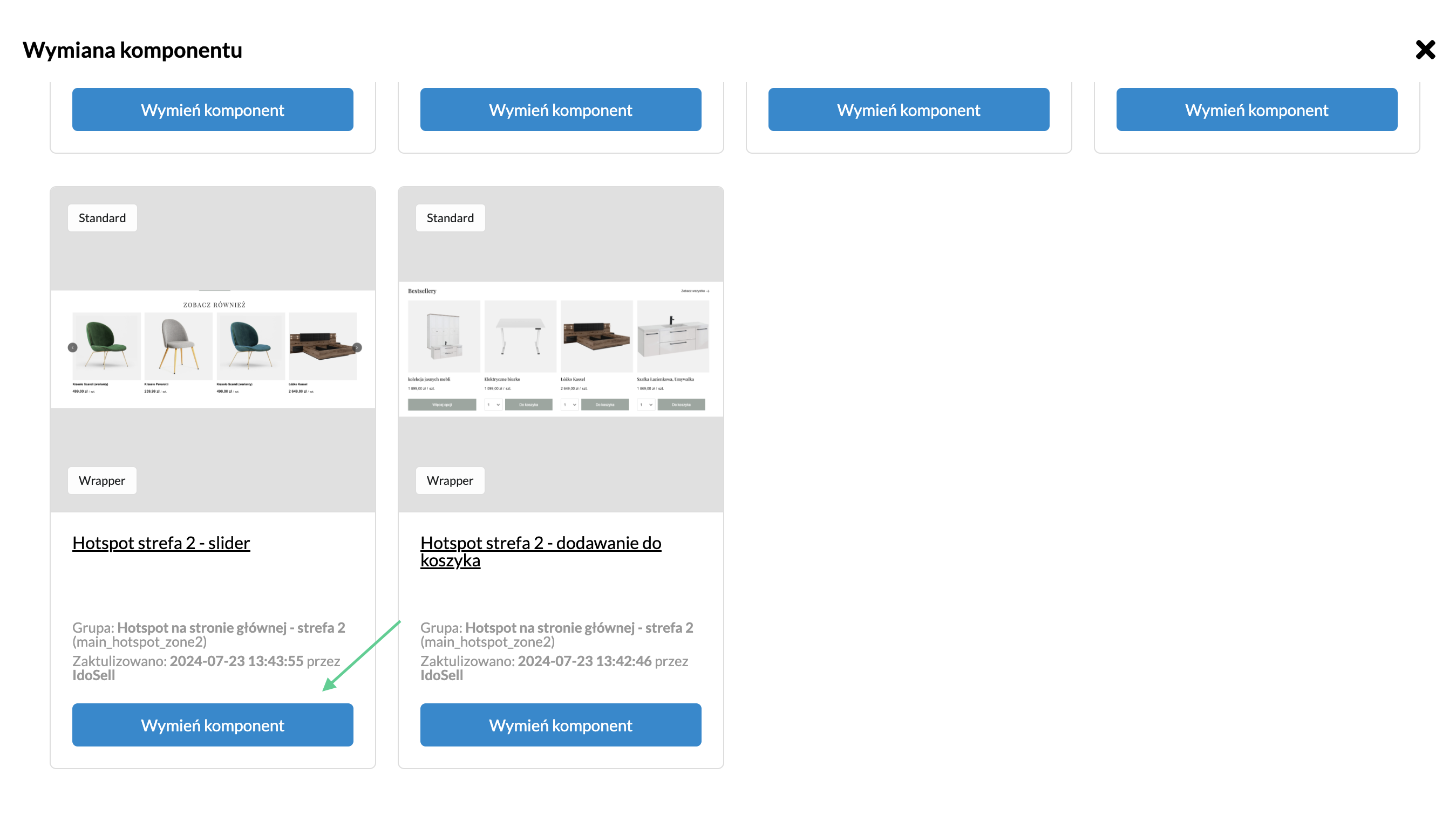 3. W przypadku szablonów bazujących na Standard Fashion v3 system aktualizacji komponentów jako domyślne strefy rekomendacji osadzi wersje statyczne. Żeby zmienić je na wersje przewijane skorzystaj z opcji "Wymień komponent" i wskaż komponent w formie slidera.