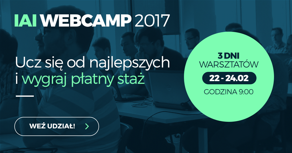 20 stycznia 2017 r. rozpoczęły się zapisy do IAI WEBCAMP #2. Zgłoszenia można wysyłać do 20 lutego do godziny 12:00. IAI WEBCAMP #2 rozpocznie się już 22 lutego 2017 o godzinie 9:00. Jest to niepowtarzalna okazja do uzyskania praktycznej wiedzy od specjalistów z IAI S.A. Co należy zrobić? Wystarczy wypełnić quiz, który jest dostępny online. Czas start! Ilość miejsc ograniczona.