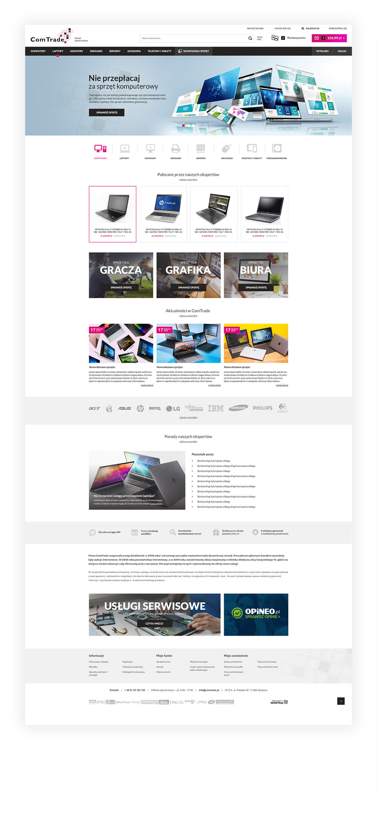 Wdrożenie sklepu było kompleksowe i oprócz nowoczesnego projektu, nawiązującego do tematu elektroniki zaprojektowaliśmy także serię banerów dzięki czemu wszystko idealnie ze sobą współgra i tworzy jedną spójną całość. Na uwagę zasługuje również czytelna lista i karta produktu, która posiada minikonfigurator sprzętu, który ułatwia zakup sprzętu o odpowiednich parametrach