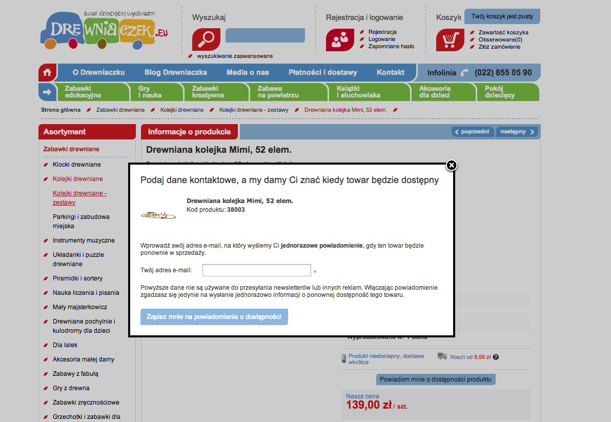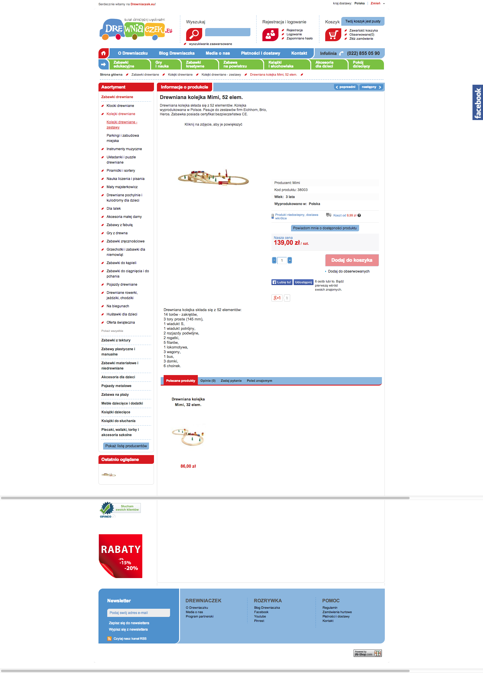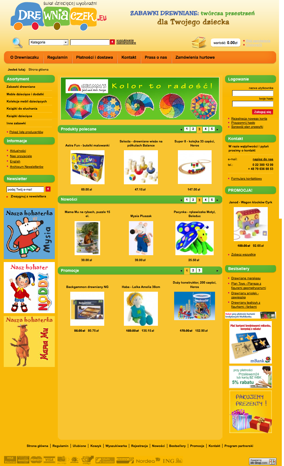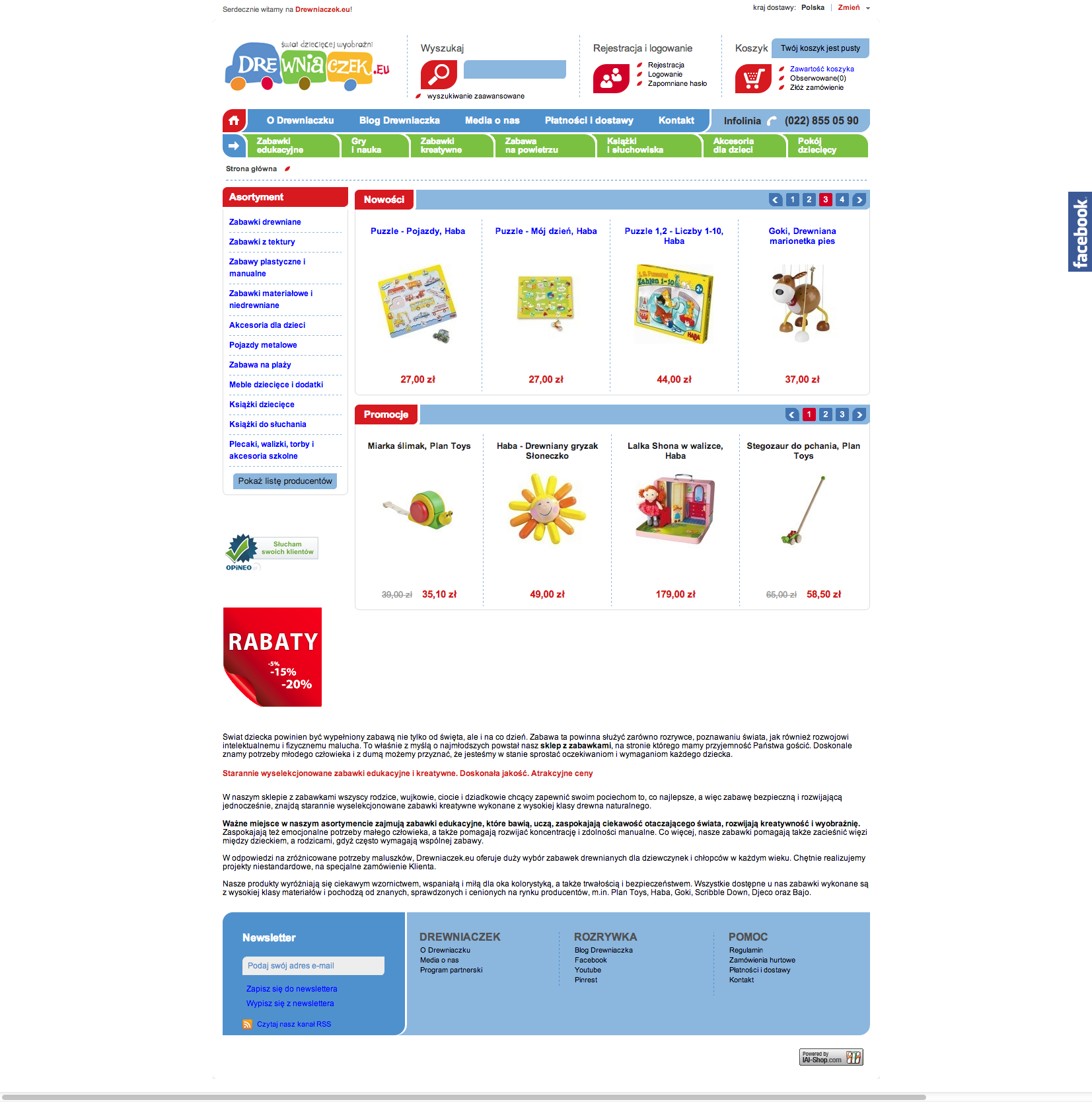 Sklep Drewniaczek.eu postał w 2007 roku na platformie innego dostawcy. W połowie 2009 roku został przeniesiony do IdoSell. Ponieważ mieliśmy już doświadczenie i wiedzieliśmy dokładnie czego potrzebujemy, zasypaliśmy dział sprzedaży, a dokładnie p. Pawła Piotucha, milionem pytań. I tu pierwszy plus dla IdoSell. Rewelacyjny sprzedawca, potrafił odpowiedzieć na każde, nawet bardzo szczegółowe pytanie.