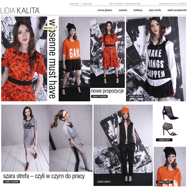 Oprócz minimalistycznego, pozbawionego grafiki nagłówka i stopki, uwagę zwraca niesymetrycznie zagospodarowana strefa bannerowa. Zdjęcia ułożone są nieregularnie tworząc ciekawą mozaikę i mieszając zdjęcia towarów, teksty i elementy "call to action".
