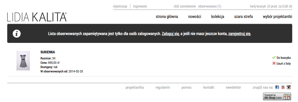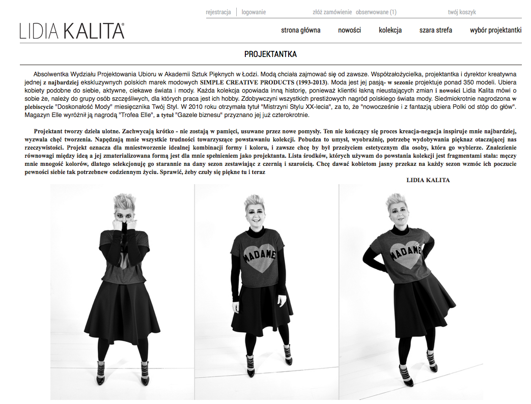 Lidia Kalita: Sprzedaż kolekcji w internecie była jednym z pierwszych planów rozwoju marki. Pomysł na e-sklep jest oczywistym wyborem dla projektanta, który rozpoczyna biznes i ze swoją ofertą chce dotrzeć do szerokiej gamy klientów. W dzisiejszych czasach nie wyobrażam sobie istnienia firmy odzieżowej czy projektanta bez dobrze i sprawnie funkcjonującego sklepu internetowego.