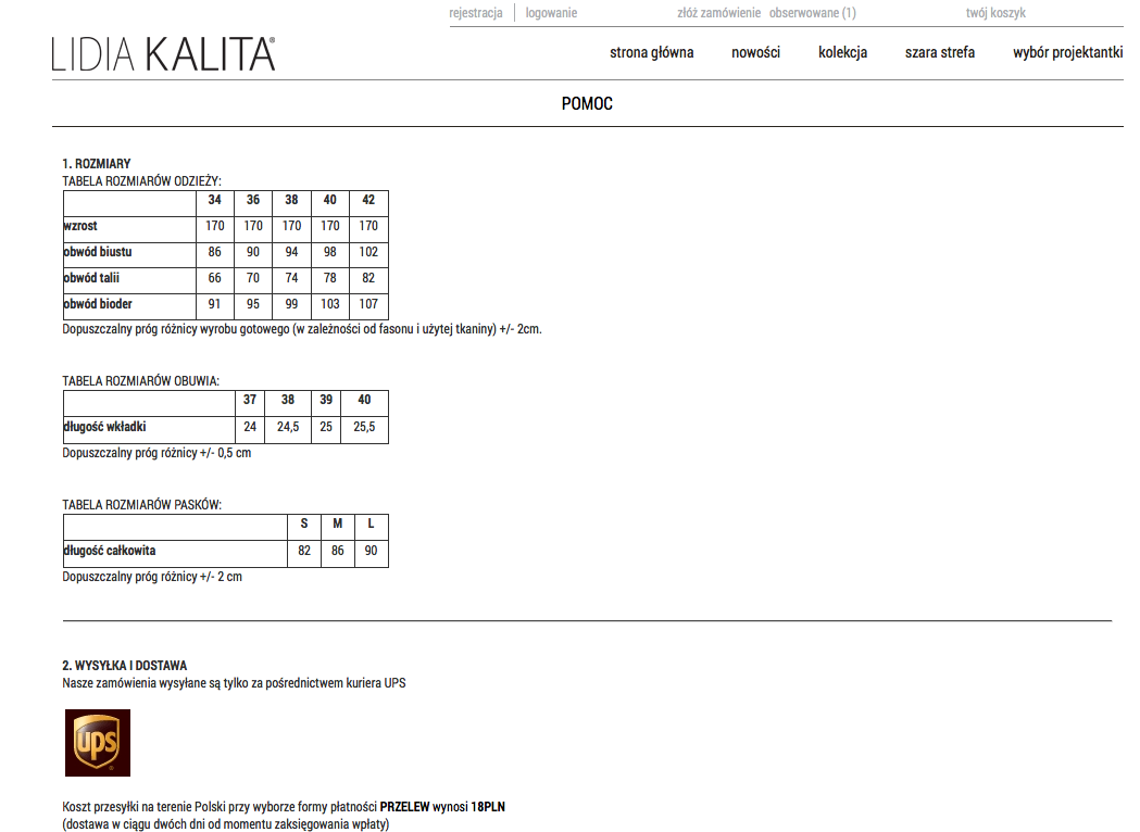 Oprawa graficzna przygotowana dla sklepu LidiaKalita.pl nawiązuje do aktualnych trendów panujących na stronach związanych z odzieżą, obuwiem i ekskluzywnym asortymentem. Zauważymy tutaj minimalistyczny design oparty na białym tle z czarnymi i szarymi akcentami. Układ sklepu idzie w parze ze stylem graficznym eksponując to co najważniejsze: stylowe zdjęcia towarów.