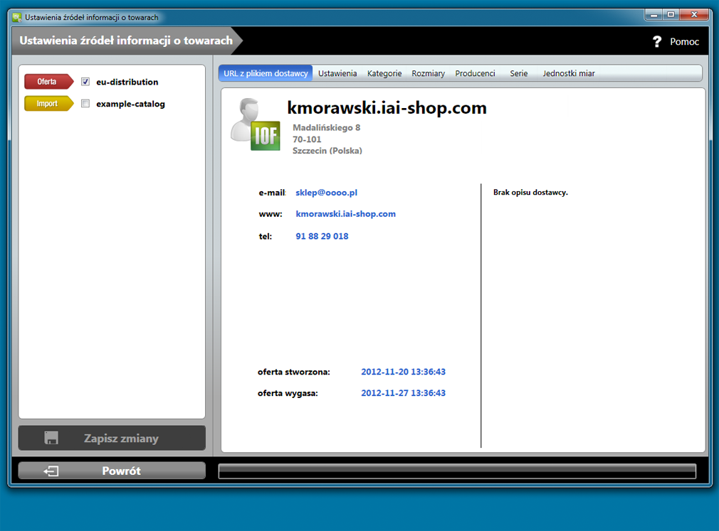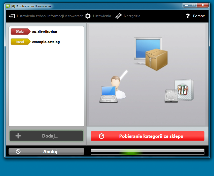IdoSell Downloader jest programem służącym do importowania i aktualizowania oferty na podstawie danych pochodzących od dostawcy. Aplikacja łączy Twój sklep z hurtownią, pobiera ofertę wraz z cenami, opisami i zdjęciami oraz w kilka chwil umieszcza ją w Twoim sklepie. Automatycznie przeprowadza także kolejne aktualizacje danych w sklepie, w razie zmiany dostępności i cen produktów w hurtowniach. IdoSell Downloader działa w oparciu o stworzony przez IAI S.A. format IOF, a także o formaty XML i CSV.