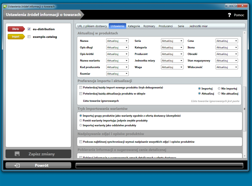 Program IdoSell Downloader jest przeznaczony dla sklepów, które chcą zautomatyzować proces importowania i aktualizowania oferty od dostawców. Jeżeli hurtownia lub dostawca ma możliwość dostarczania oferty w jednym z obsługiwanych przez IdoSell Downloader formatów, możesz w wygodny sposób pobrać ofertę od dostawcy, a następnie ją automatycznie aktualizować. Nie będzie wymagana żadna ingerencja ludzka, ponieważ IdoSell Downloader sam wykryje zmiany w ofercie i zaktualizuje towary w IdoSell. Dzięki temu towary prezentowane w Twoim sklepie będą w pełni zgodne z ofertą dostawcy.