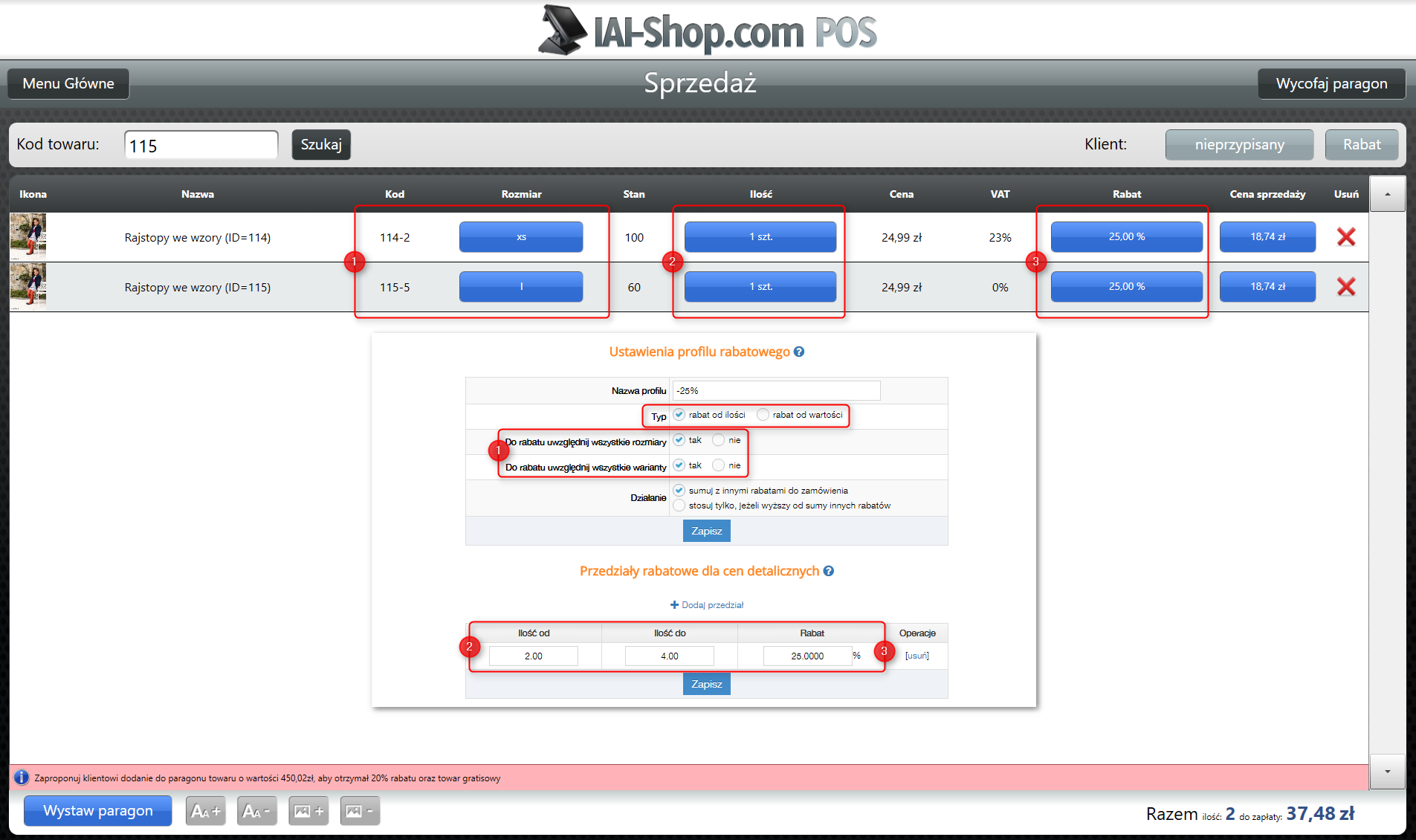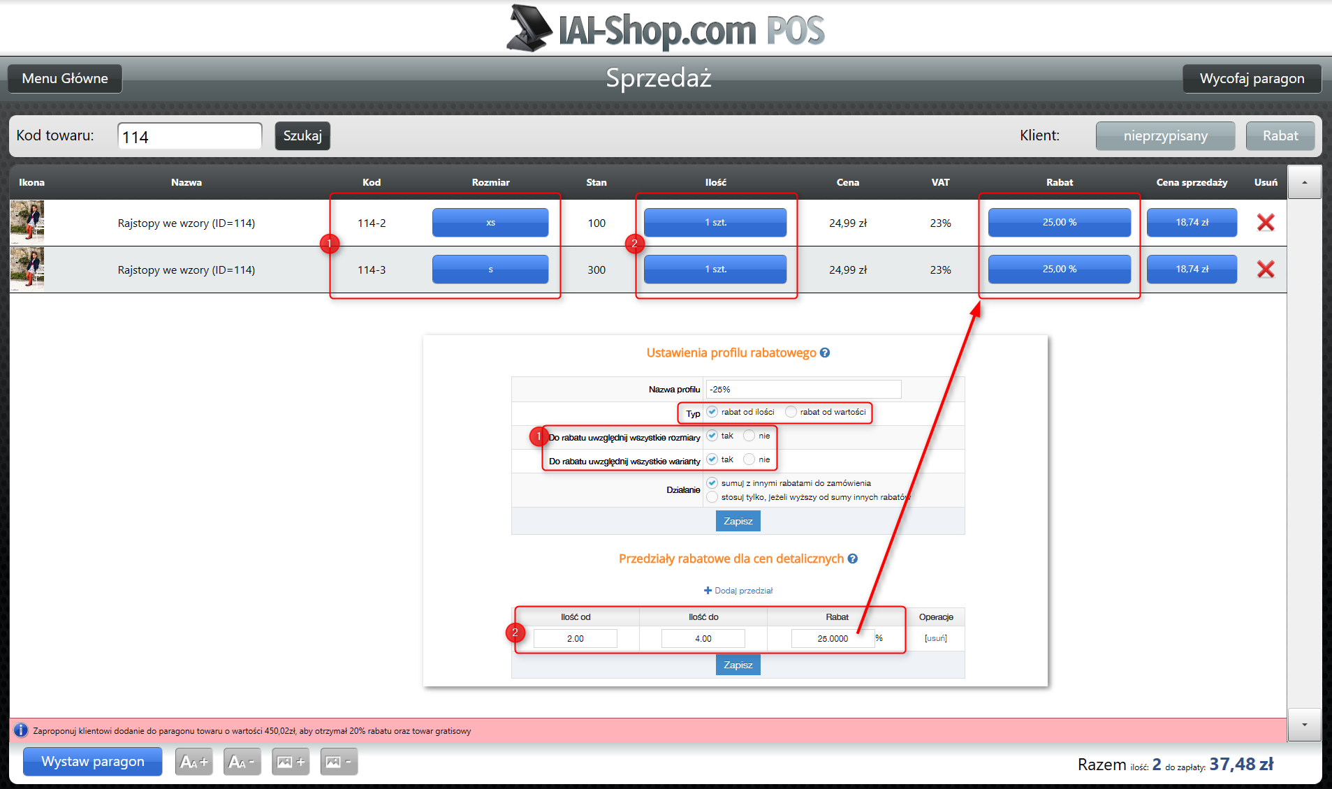 Relację pomiędzy konfiguracją rabatów ilościowych i wartościowych w panelu a podglądem paragonu w IdoSell POS przedstawiają poniższe przykłady