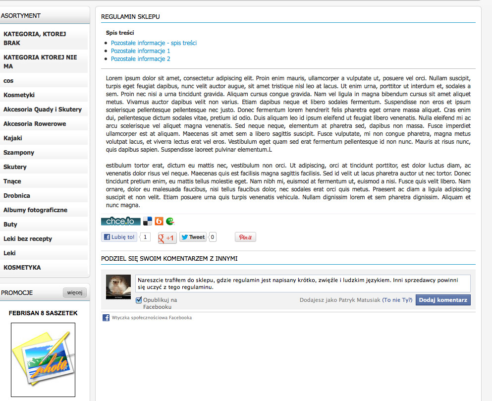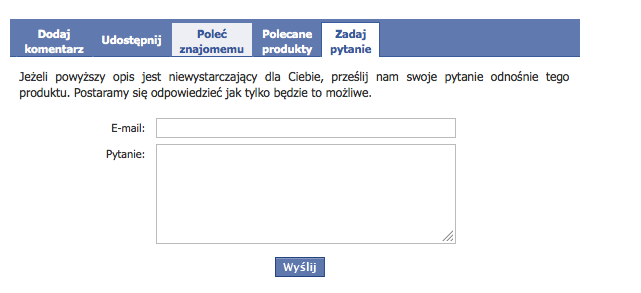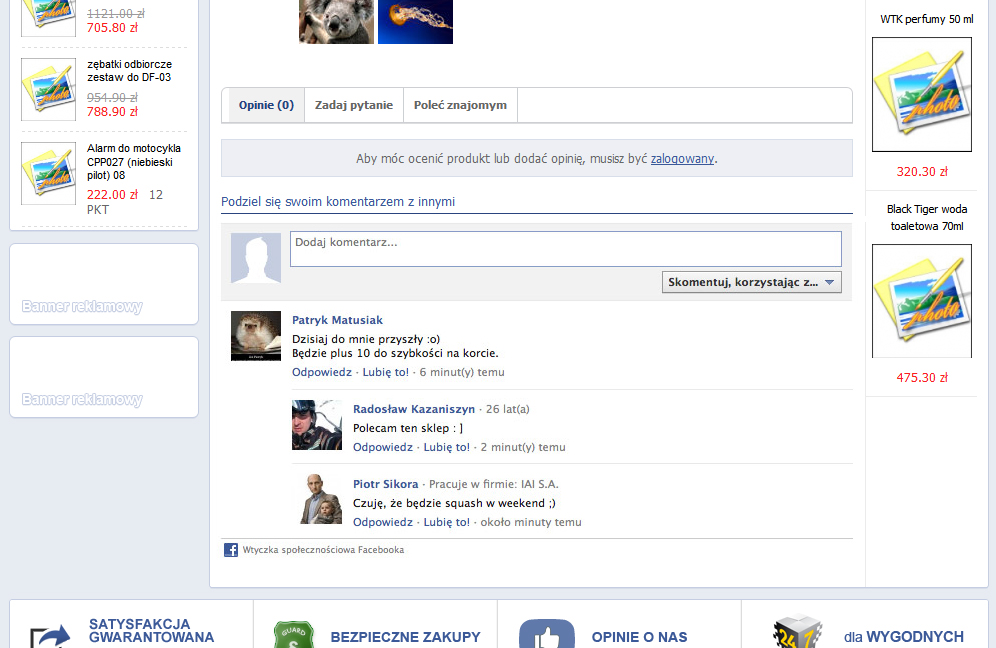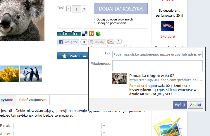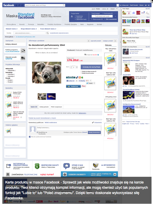 Sklep internetowy na FB powinien wykorzystać jego wszystkie opcje społecznościowe. Przy każdym towarze musi być przycisk „Lubię to”. Obowiązkowe jest także wykorzystanie opcji „Udostępnij” („Share it”). Masz wtedy szanse, że towar ze sklepu, wraz z odpowiednim komentarzem (np. „marzę o tym na urodziny”) znajdzie się na tablicy klienta i w świadomości wszystkich jego znajomych.
