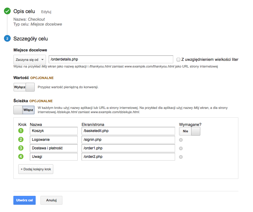 Pierwszym etapem jest podanie takich danych jak nazwa celu (która może być dowolna) oraz typu celu (w tym przypadku miejsce docelowe). Następnie należy skonfigurować szczegóły celu, które to będą zawierały wszystkie kroki, przez które przechodzi kupujący: