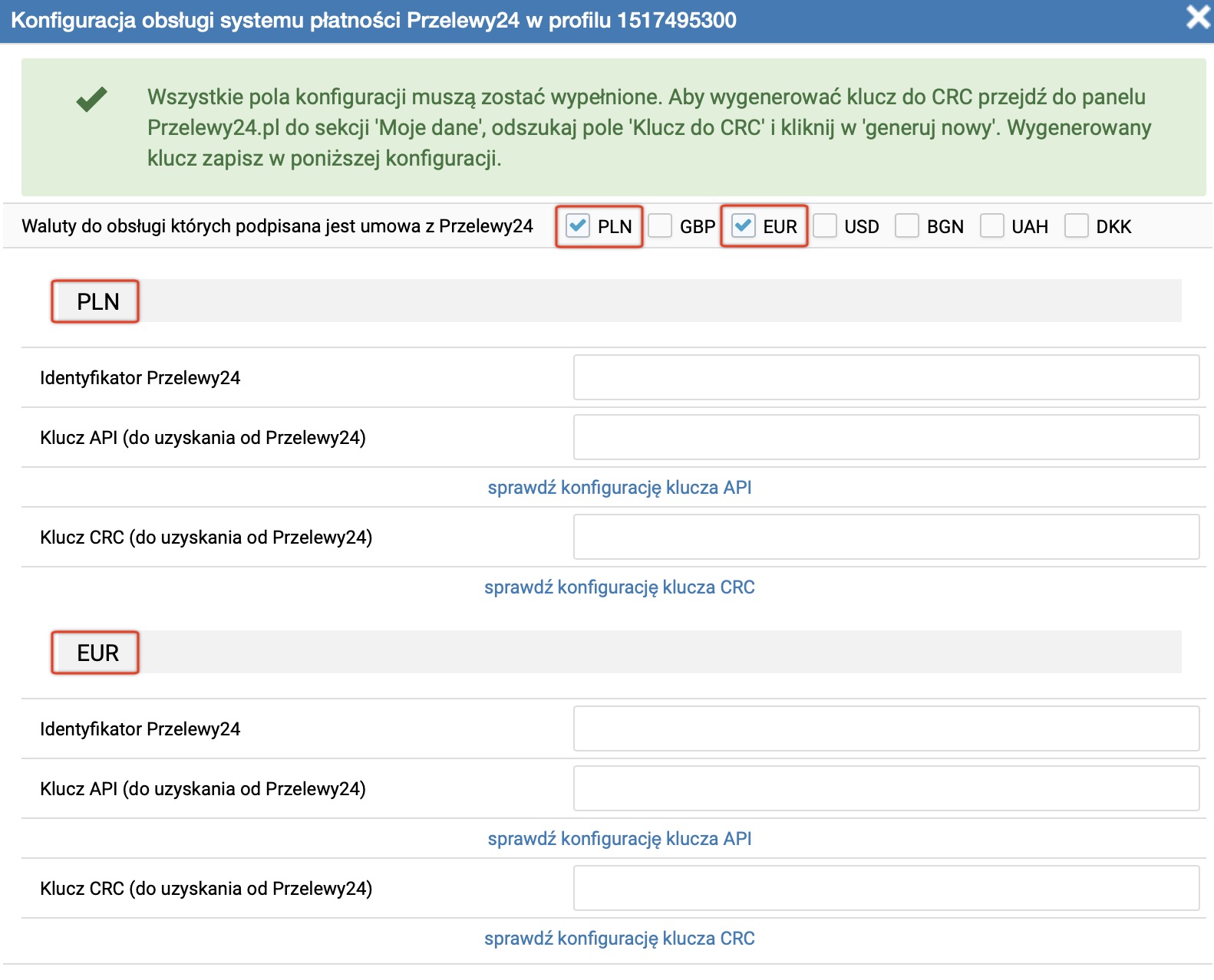 Dla każdej waluty możesz osobno skonfigurować połączenie z Przelewy24: