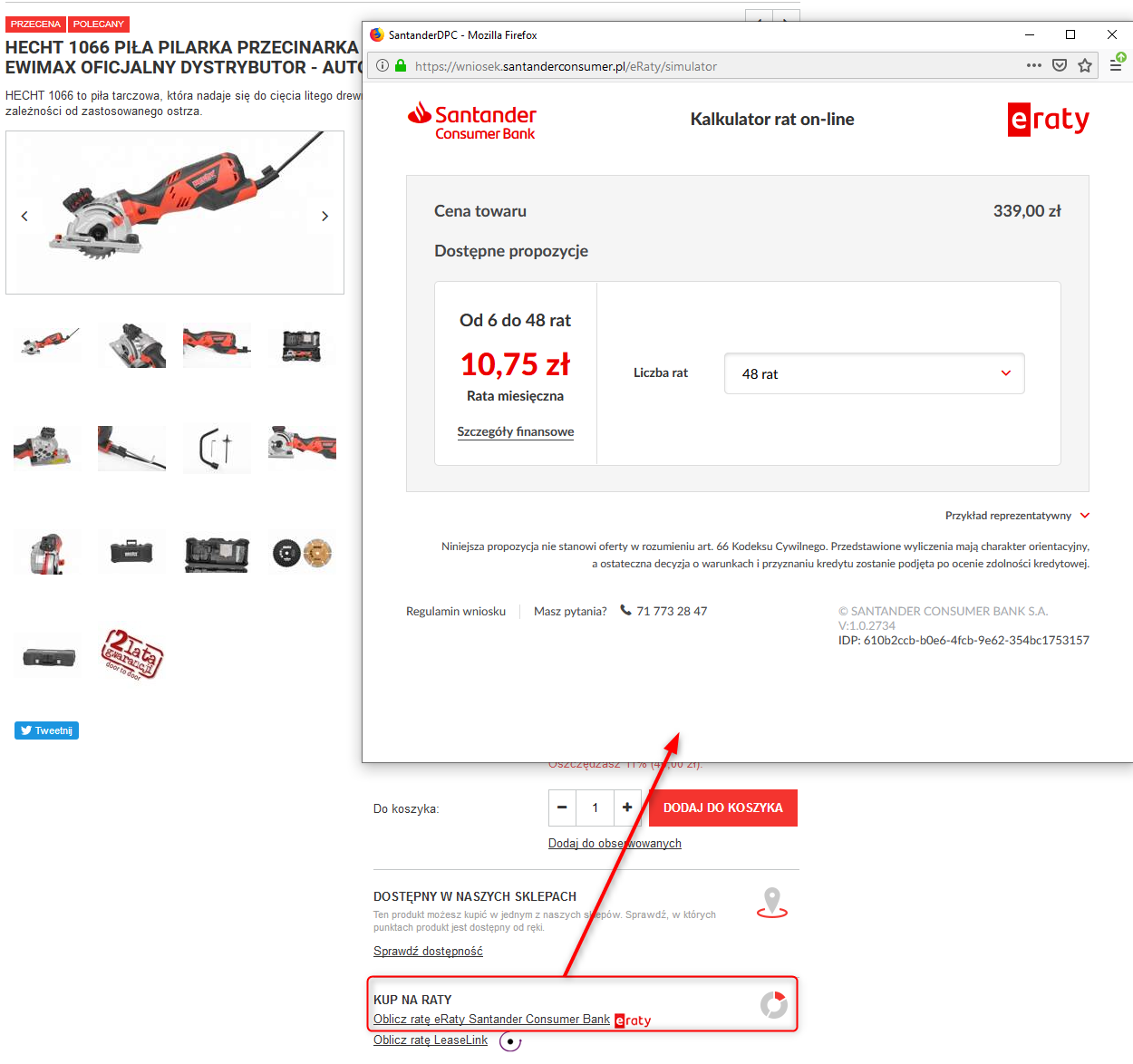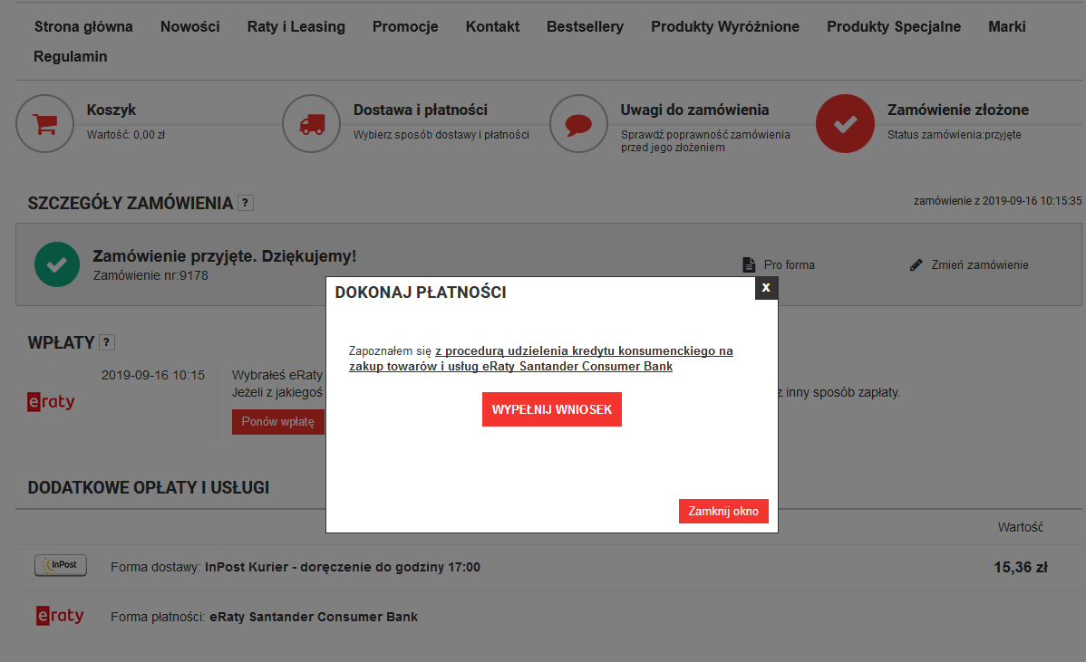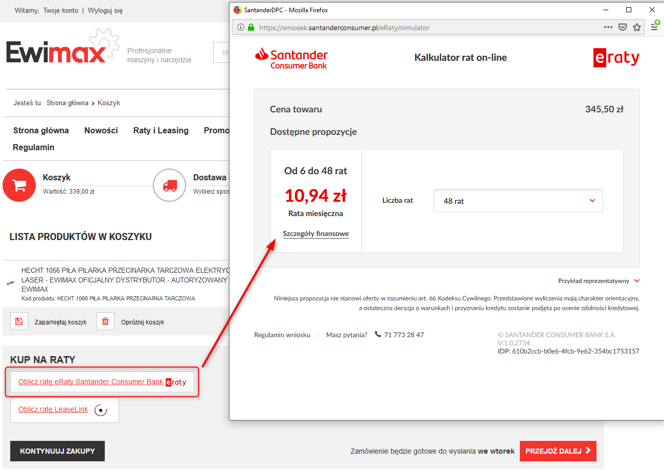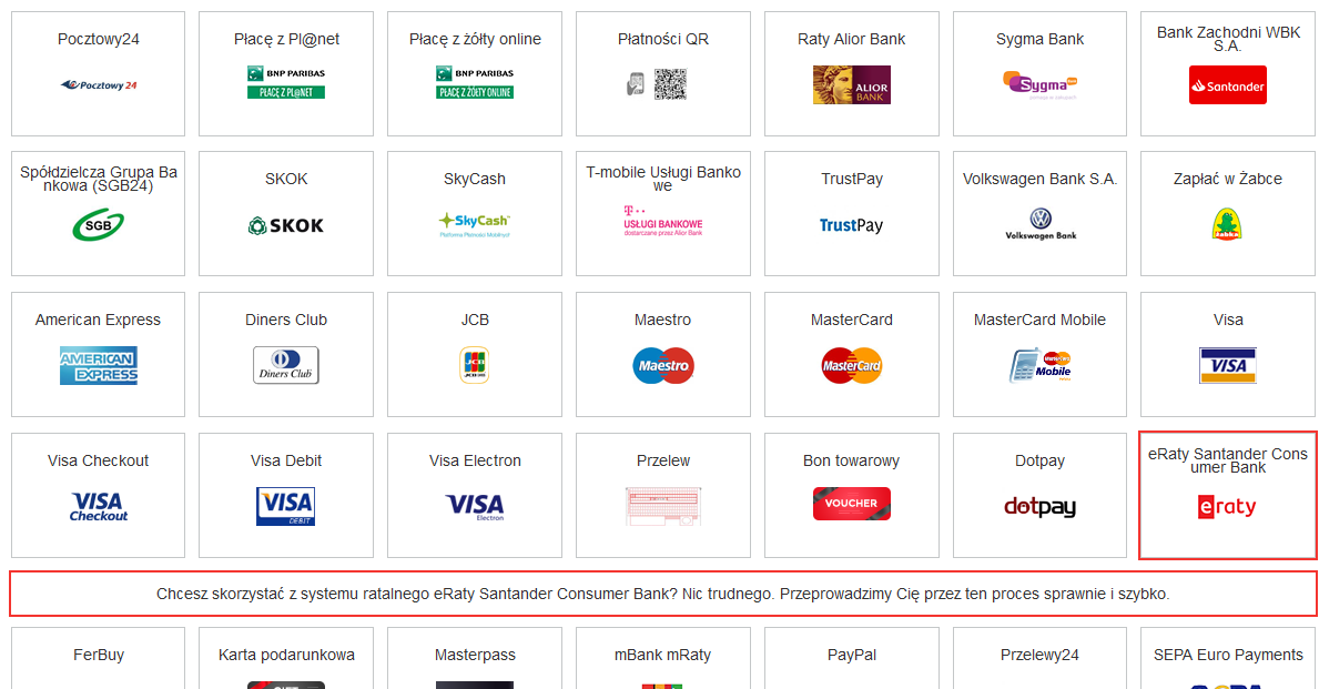 Na każdej stronie produktu oraz w koszyku klient ma możliwość sprawdzenia wysokości raty, wywołując symulator ratalny za pomocą przycisku "Oblicz ratę". Złożenie wniosku jest również proste – wystarczy, że Twój klient wybierze eRaty jako sposób płatności, uzupełni na bezpiecznej stronie nieskomplikowany wniosek kredytowy i będzie postępował według komunikatów przesyłanych poprzez email oraz udostępnionych w dedykowanej aplikacji. Co więcej Santander Consumer Bank S.A. jest naszym zaufanym partnerem, co gwarantuję wysoki standard bezpieczeństwa.