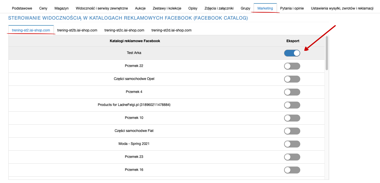 Aby dodać lub usunąć produkt, wystarczy na karcie towaru przejść do zakładki MARKETING, w STEROWANIE WIDOCZNOŚCIĄ W KATALOGACH REKLAMOWYCH FACEBOOK (FACEBOOK CATALOG) wybrać interesujące Ciebie Katalogi Facebooka.
