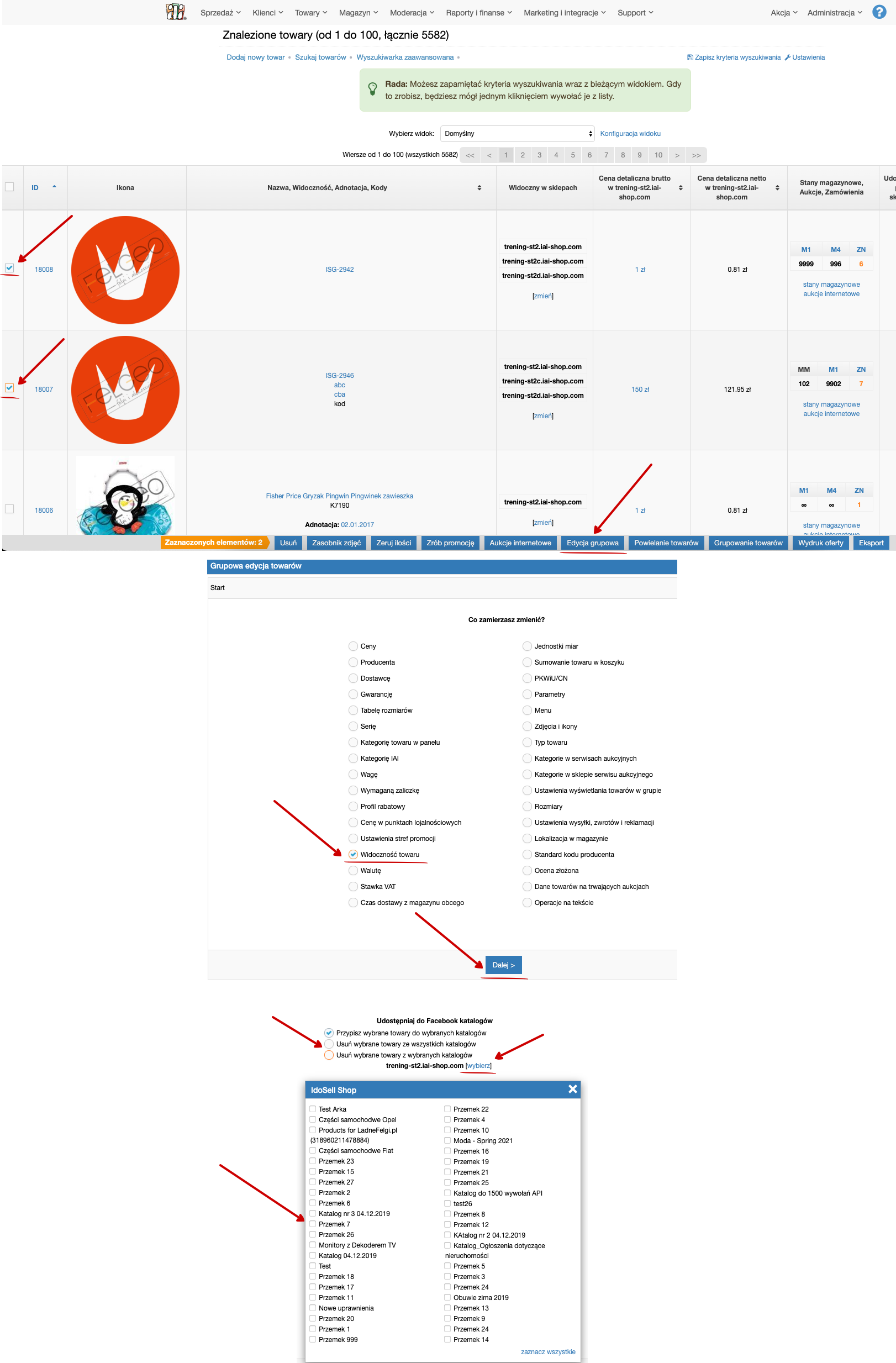 Aby dodać lub usunąć produkty z Katalogów Facebooka wystarczy, że w wyszukiwarce towarów zaznaczysz produkty i przejdziesz do EDYCJA TOWARÓW / WIDOCZNOŚĆ TOWARU / UDOSTĘPNIAJ DO FACEBOOK KATALOGÓW, pozostaje Ci tylko wybrać czy chcesz dodać lub usunąć produkty i wybrać odpowiedni katalog Facebooka