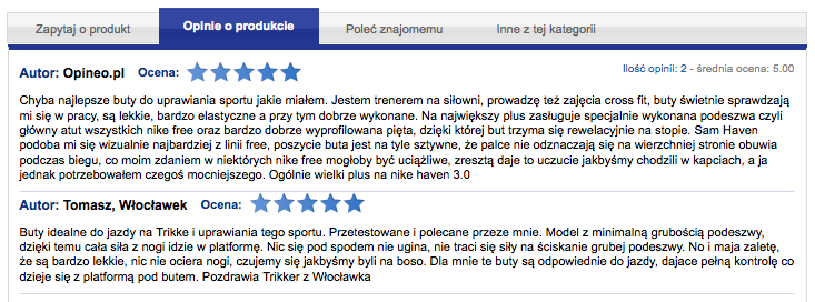Zaimportowane opinie wyświetlają się na karcie towaru w identyczny sposób jak zwykłe opinie, różnią się jedynie autorem, który zawsze widnienie jako Opineo.pl