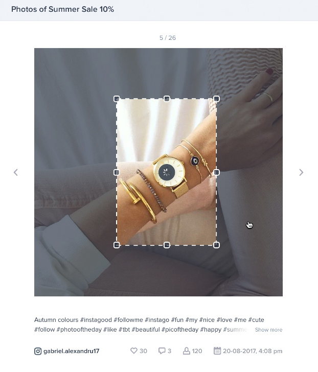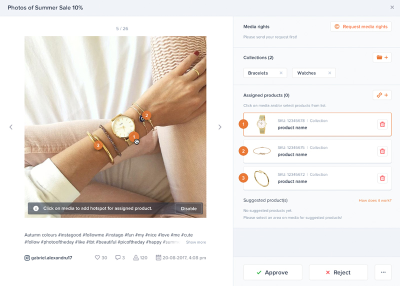Proces łączenia jest jeszcze łatwiejszy dzięki Photoslurp Recognize, funkcji rozpoznawania obrazu. Przypisywanie produktów do treści staje się niezwykle proste dzięki tej technologii, która identyfikuje produkty w Twoich treściach, abyś mógł je natychmiast zatwierdzić i połączyć.