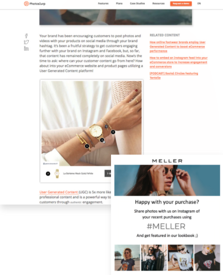 Treści generowane przez użytkowników są korzystne nie tylko dla Twojego sklepu eCommerce, więc rozszerz swój zasięg, wyświetlając treści wszędzie tam, gdzie są Twoi klienci. Czy to na blogu, czy w newsletterach. Możesz nawet przenieść swoją integrację na wyższy poziom, wyświetlając treści klientów na żywo w sklepie lub podczas wydarzeń.