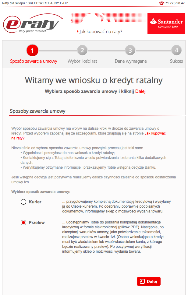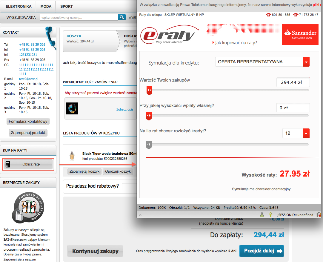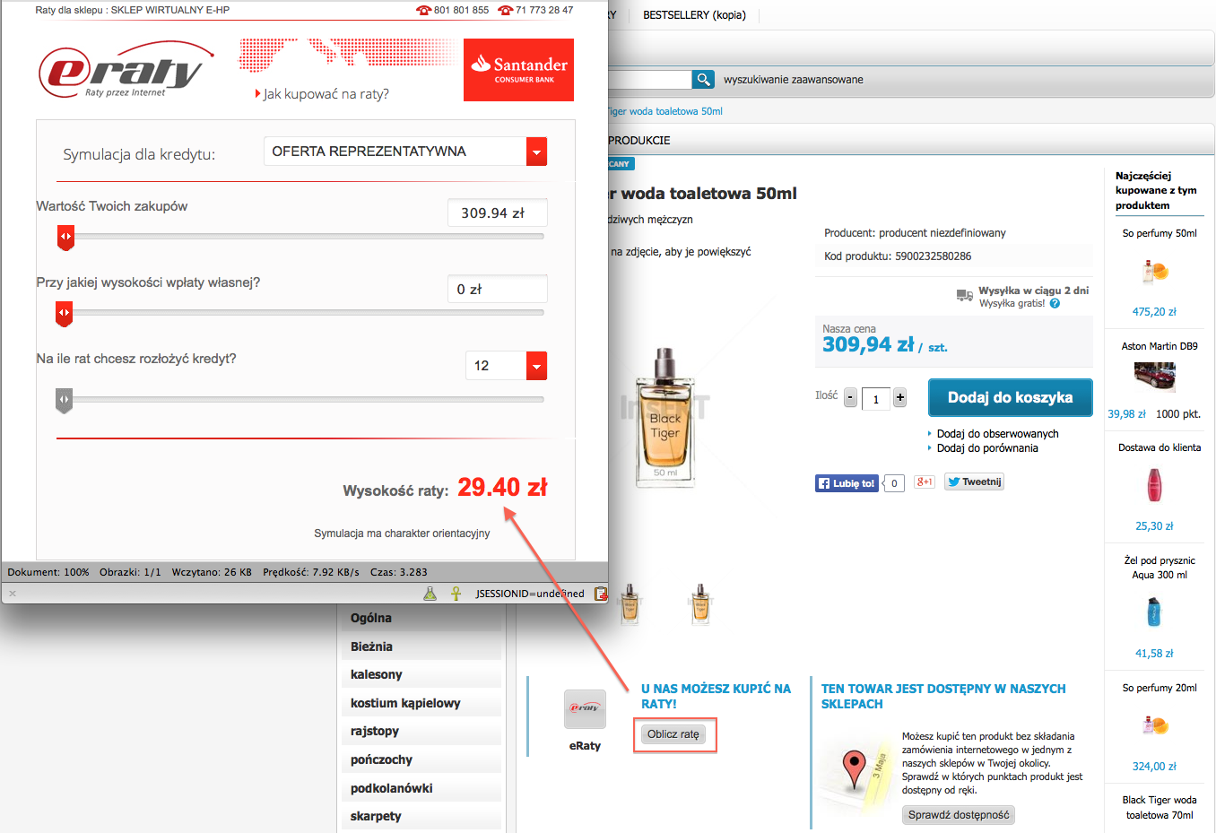 Na każdej stronie produktu oraz w koszyku klient ma możliwość sprawdzenia wysokości raty, wywołując symulator ratalny za pomocą przycisku "Oblicz ratę". Złożenie wniosku jest również proste – wystarczy, że Twój klient wybierze eRaty jako sposób płatności, uzupełni na bezpiecznej stronie nieskomplikowany wniosek kredytowy i będzie postępował według komunikatów przesyłanych poprzez email oraz udostępnionych w dedykowanej aplikacji. Co więcej Santander Consumer Bank S.A. jest naszym zaufanym partnerem, co gwarantuję wysoki standard bezpieczeństwa.