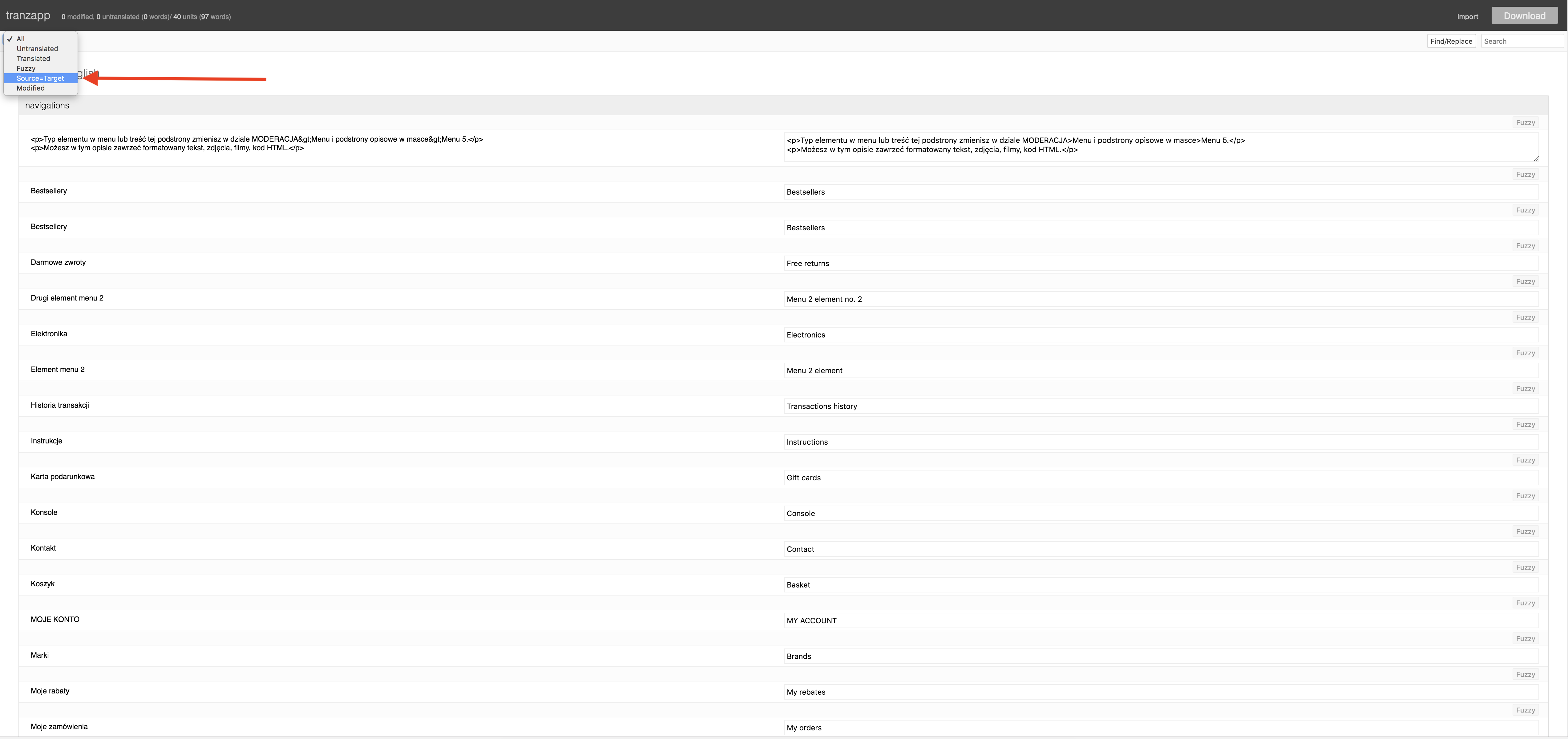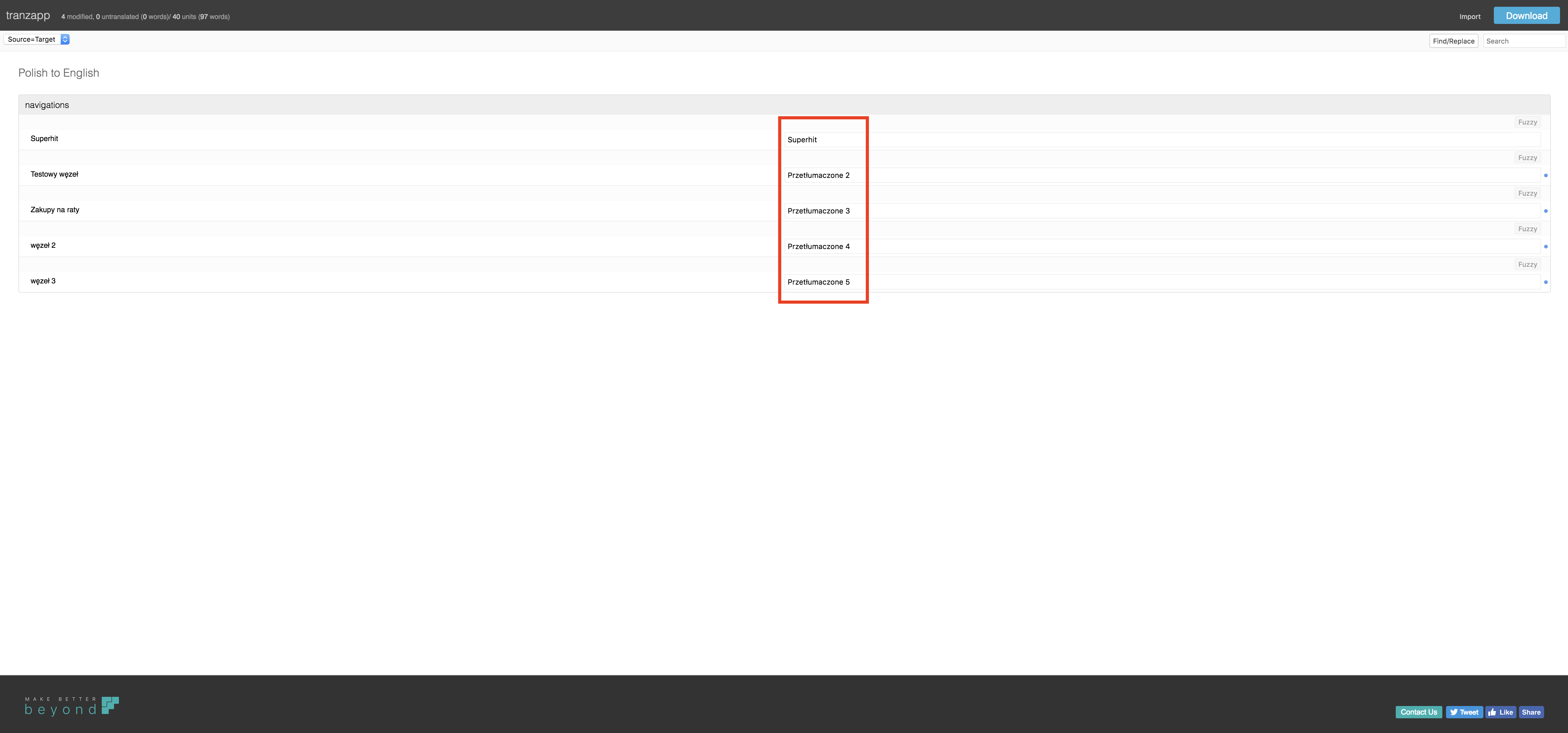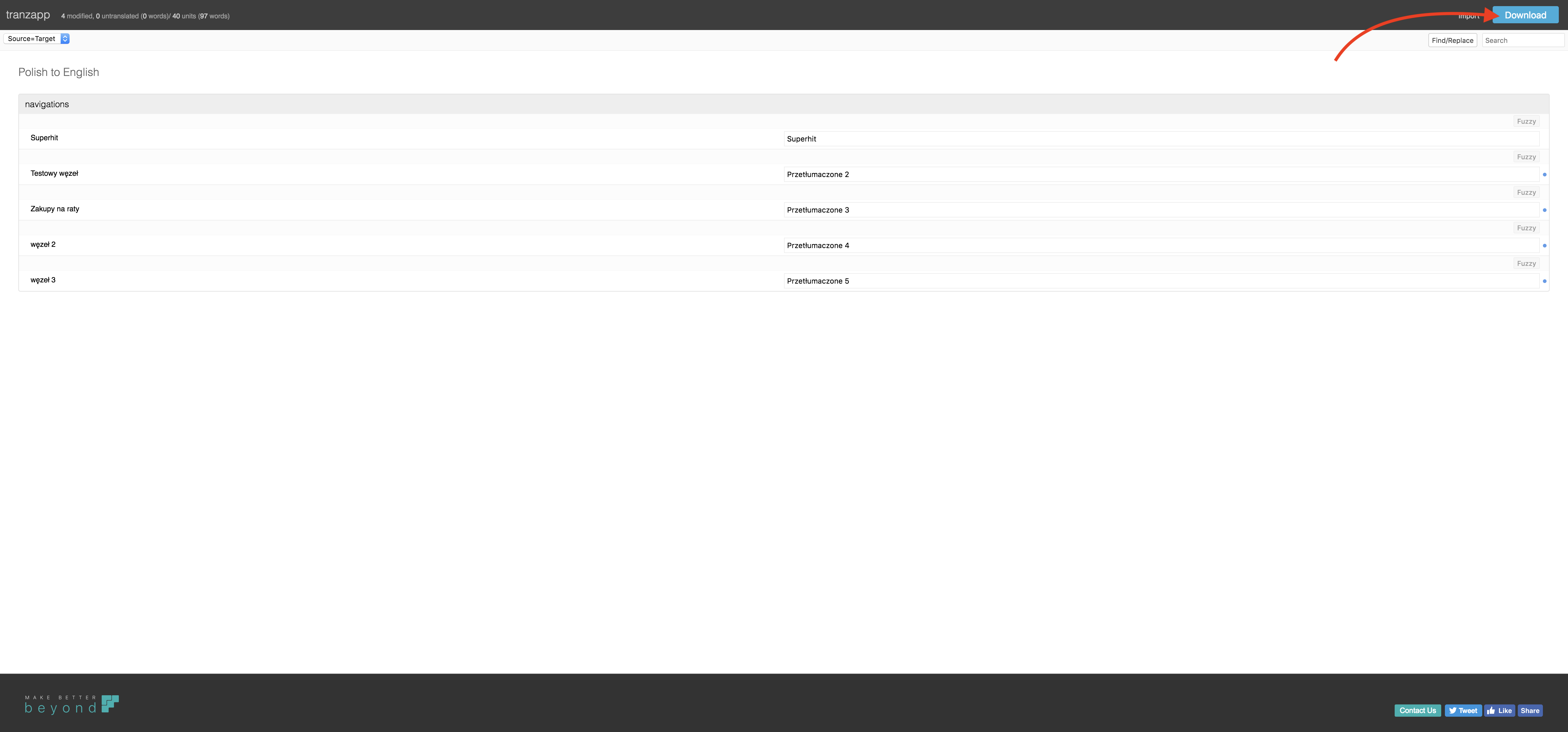 Poniższy poradnik przeprowadzi Cię krok po kroku jak samodzielnie przetłumaczyć swój uprzednio wyeksportowany z panelu plik XLIFF na dowolny język. Pobierz plik z panelu, wejdź na stronę http://www.beyondf.com/tranzapp/translate/ i zacznij tłumaczyć swój sklep. Po przetłumaczeniu pliku wgraj go do panelu zgodnie z instrukcją tłumaczenia oferty lub maski sklepu.