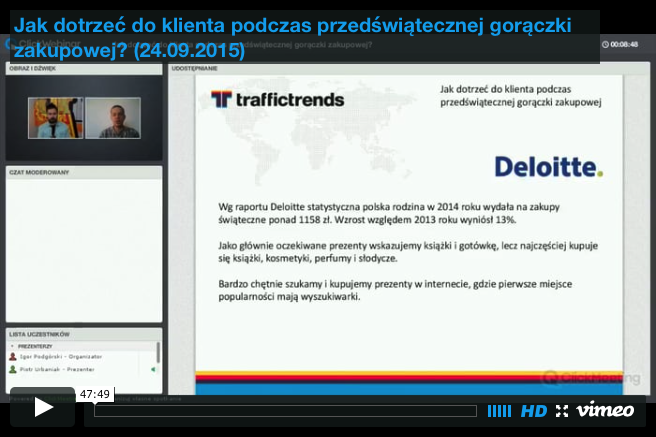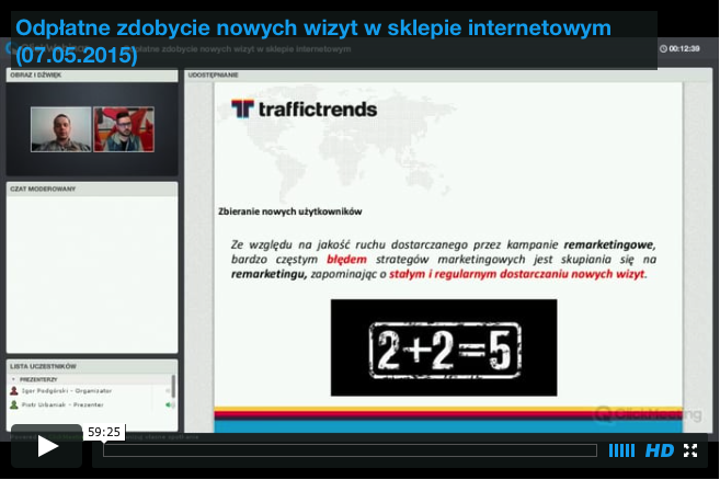 Trzeci z serii webinarów "Rozwijaj się albo giń", na którym Piotr Urbaniak z Traffic Trends przedstawia 13 dobrych praktyk reklamowych. Webinar dedykowany dla wszystkich, którzy prowadzą sklepy internetowe w różnych branżach. Pozycja obowiązkowa. Polecamy.