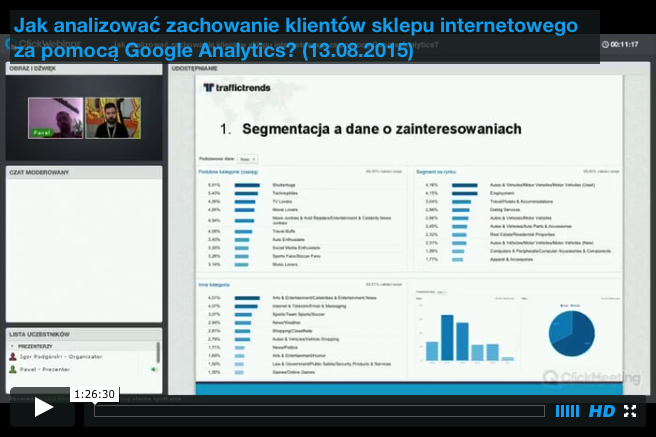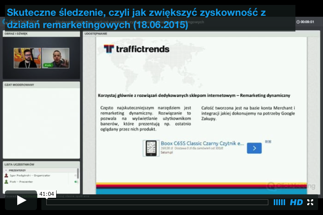 Masz czasami wrażenie, że reklamy produktu, którym się interesujesz śledzą Cię w Internecie? Widzisz je na Facebooku i na innych serwisach internetowych. To nie jest przypadek. To dokładnie przemyślana strategia marketingowa, która oparta jest na tak zwanym remarketingu. Jest to niebywale skuteczne narzędzie, które wspiera sprzedaż w sklepie internetowym i obniża koszty pozyskania klienta. Wraz z Piotrem Urbaniakiem, reprezentantem naszego partnera Traffic Trends, zapraszamy do obejrzenia nagrania z webinaru.