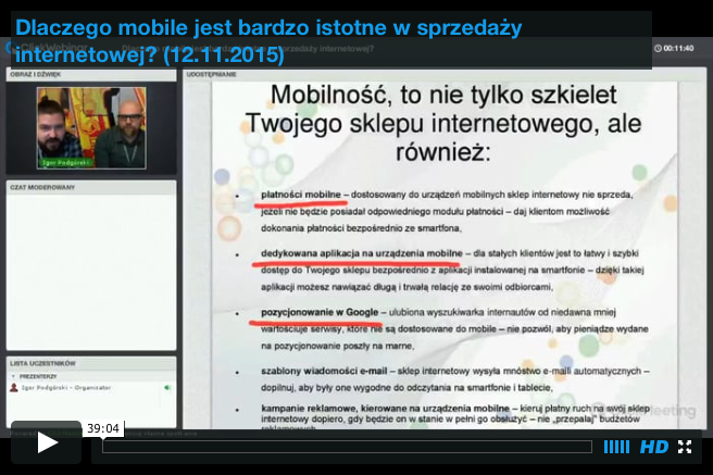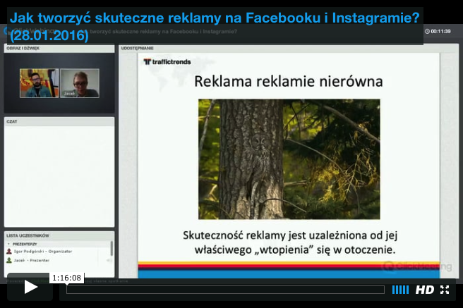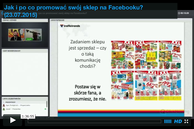 Być może nie promujesz swojego sklepu internetowego na Facebooku. Być może uważasz, że to nie miejsce dla niego. Być może założyłeś profil, publikujesz posty, ale tak naprawdę nie wiesz jak robić to prawidłowo i czego oczekiwać. Być może masz przekonanie, że Twój fan page jest prowadzony optymalnie i bez inwestowania pokaźnych sum wiele więcej zrobić się nie da. Nic bardziej mylnego... Obejrzyj nagranie i zobacz jak robić to dobrze.