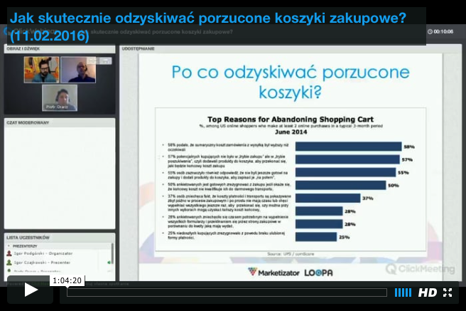 Porzucane koszyki zakupowe to bolączka sklepów internetowych, ponieważ zgodnie z badaniami aż około 60% klientów rezygnuje z zakupów już na samym końcu procesu zakupowego. Przyczyn jest wiele i wbrew pozorom w większości nie oznaczają, że Twój klient nie chce dokonać zakupu. Przeważnie z jakiegoś powodu klient odkłada zakupy na później, co w efekcie sprawia, że jego potencjał zakupowy z czasem maleje. Na nagraniu przedstawiamy metody na skuteczne odzyskiwanie porzuconych koszyków zakupowych.