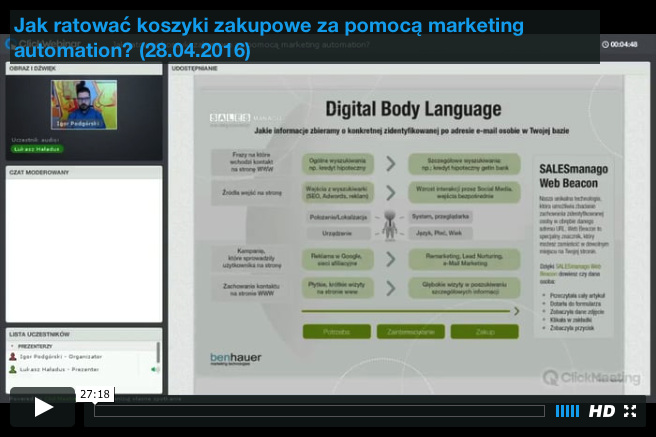Ratowanie koszyków zakupowych to jedna z najczęściej poruszanych kwestii w e-commerce. Nie ma się co dziwić, w końcu od skuteczności procesu zakupowego i samego koszyka zależy los sklepu internetowego i ludzi, którzy za nim stoją. Dlatego z przyjemnością przedstawiamy skuteczne metody na ratowanie porzuconych koszyków zakupowych z wykorzystaniem marketing automation. Zapraszamy do obejrzenia nagrania z webinaru, który został przeprowadzony przez Łukasza Haładusa, przedstawiciela SALESmanago.