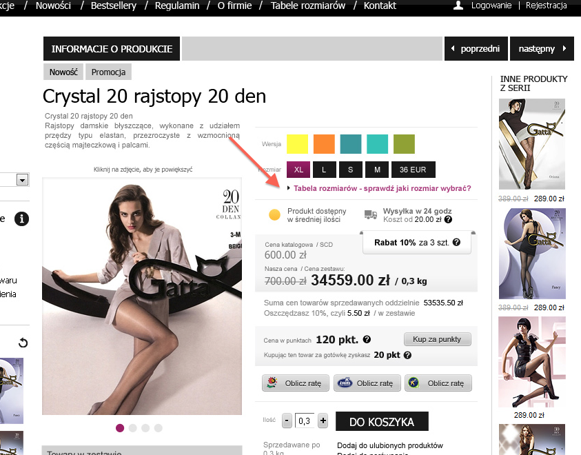 Tabela rozmiarów towaru w sklepie internetowym