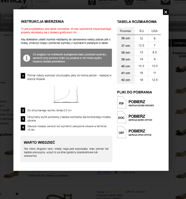 Nie musisz pilnować, aby w tabeli rozmiarów w sklepie wyświetlały się te rozmiary, które posiada dany towar. Jeżeli do tabeli rozmiarów dodasz wszystkie możliwe rozmiary butów jakie posiadasz w ofercie, a przeglądany towar posiada tylko kilka z nich, system sam wybierze i wyświetli odpowiednie rozmiary. Jeżeli sprzedajesz towary różnego typu, np. biustonosze i rajstopy, wystarczy, że utworzysz jedną tabelę rozmiarów i dodasz do niej rozmiary dla biustonoszy i rajstop. Jeżeli odwiedzający będzie oglądał biustonosze, w tabeli rozmiarów pojawią się tylko rozmiary dla biustonoszy. Jeżeli wybierze rajstopy, wyświetlą się rozmiary tylko dla rajstop.