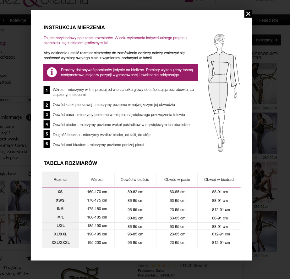 Będąc Klientem IAI posiadasz w swoim Panelu Administracyjnym gotowe narzędzie do zarządzania tabelami rozmiarów. Aby wyświetlać tabele rozmiarów w sklepie, konieczne jest posiadanie odpowiedniego komponentu w masce. Skontaktuj się z naszym działem graficznym, który wyceni, zaprojektuje i dostosuje tabele rozmiarów zgodnie z Twoimi wymaganiami. Dział graficzny IAI pozostaje do Twojej dyspozycji przez cały okres naszej współpracy.