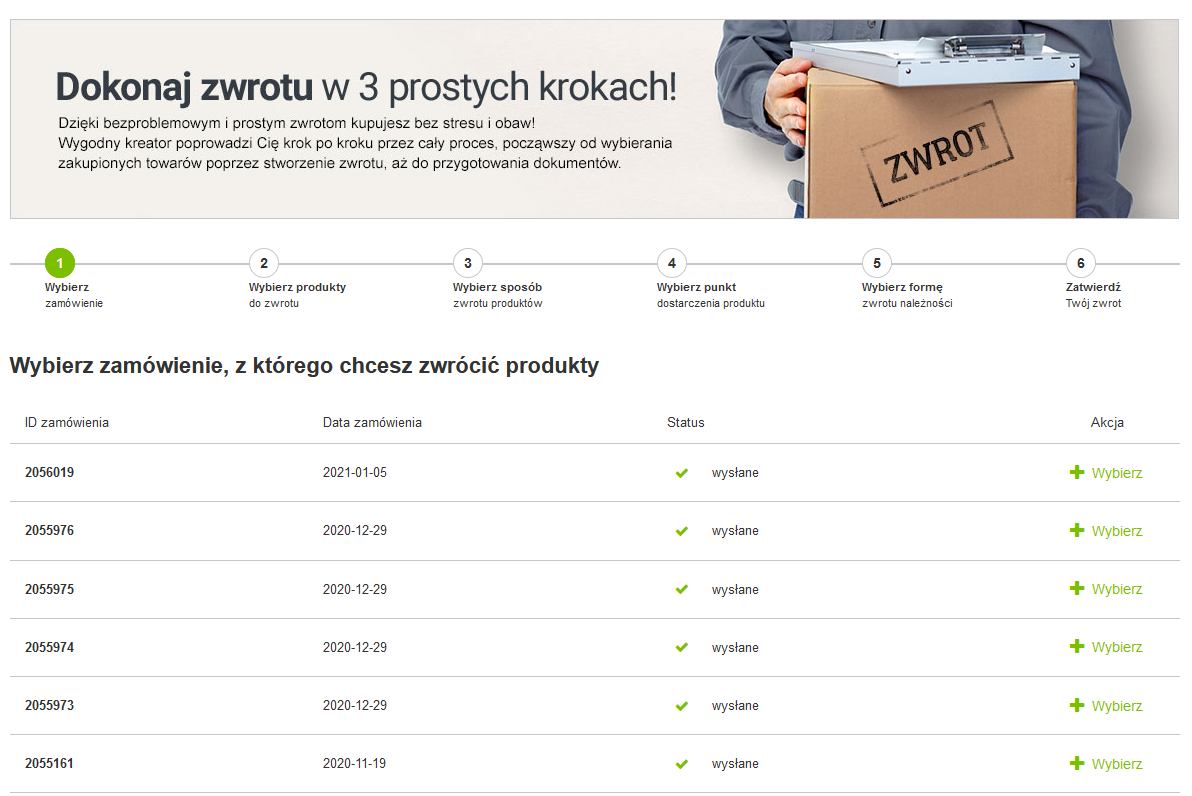• Wybiera zamówienie z którego chce zwrócić towary