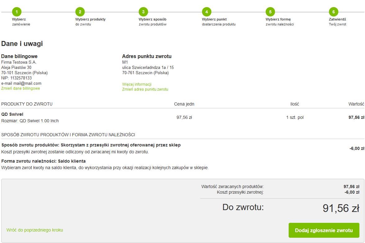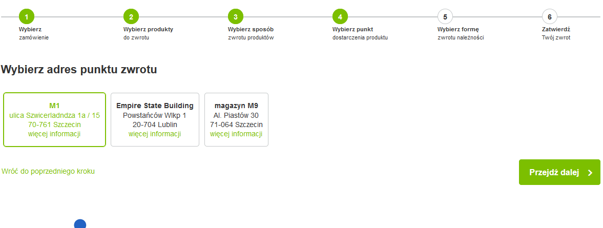• Wybiera adres punktu zwrotu (każdy magazyn który obsługuje zwroty)